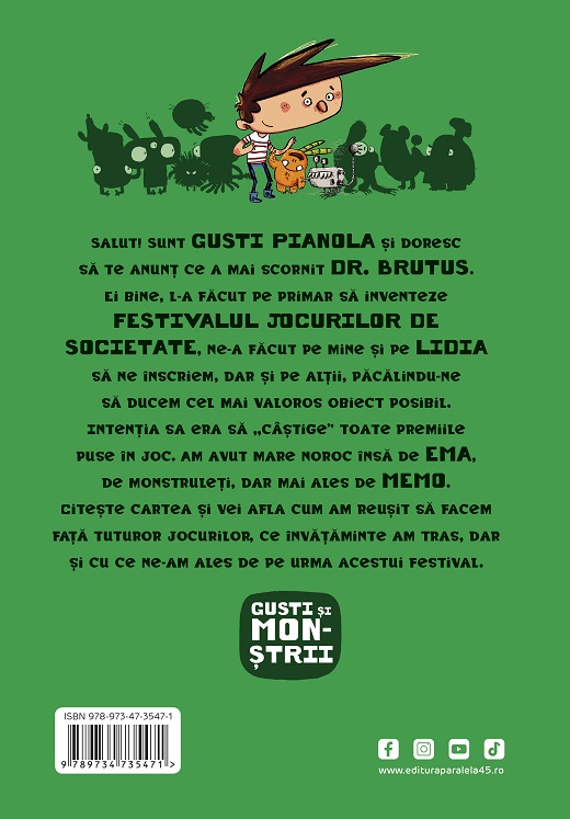 Salut! Sunt GUSTI PIANOLA și doresc să te anunț ce a mai scornit DR. BRUTUS. Ei bine, l-a făcut pe primar să inventeze FESTIVALUL JOCURILOR DE SOCIETATE, ne-a făcut pe mine și pe LIDIA să ne înscriem, dar și pe alții, păcălindu-ne să ducem cel mai valoros obiect posibil. Intenția sa era să „câștige” toate premiile puse în joc. Am avut mare noroc însă de EMA, de monstruleți, dar mai ales de MEMO. Citește cartea și vei afla cum am reușit să facem față tuturor jocurilor, ce învățăminte am tras, dar și cu ce ne-am ales de pe urma acestui festival.
