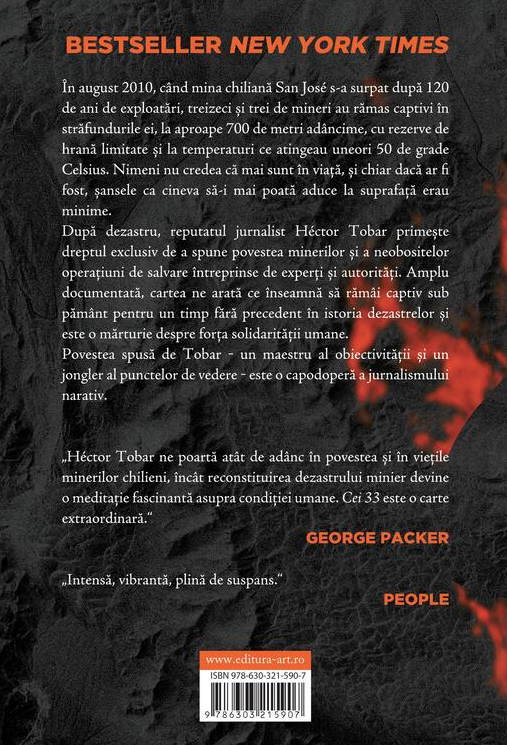 „Héctor Tobar ne poartă atât de adânc în povestea și în vieţile minerilor chilieni, încât reconstituirea dezastrului minier devine o meditaţie fascinantă asupra condiției umane. Cei 33 este o carte extraordinară."