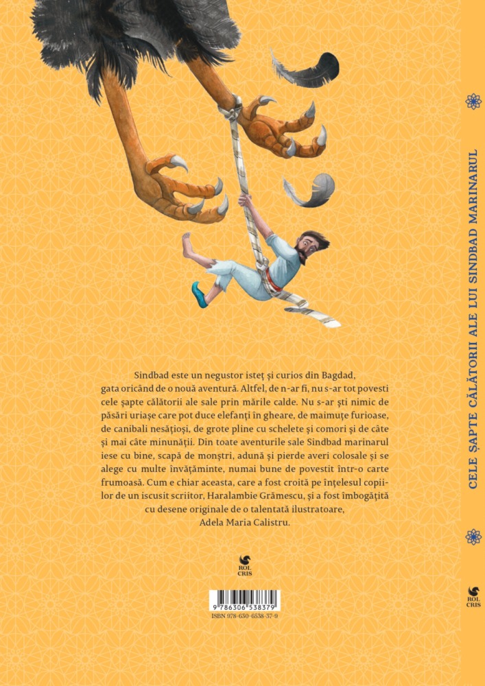 Din toate aventurile sale Sindbad marinarul iese cu bine, scapa de monstri, aduna si pierde averi colosale si se alege cu multe invataminte, numai bune de povestit intr-o carte frumoasa. Cum e chiar aceasta, care a fost croita pe intelesul copiilor de un iscusit scriitor, Haralambie Gramescu, si a fost imbogatita cu desene originale de o talentata ilustratoare, Adela Maria Calistru.