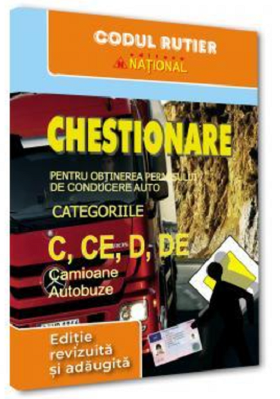Actualizata, completata si revizuita, lucrarea CHESTIONARE PENTRU OBTINEREA PERMISULUI DE CONDUCERE AUTO CATEGORIILE C, CE, D, DE, editia 2025, reprezinta, de fapt, un pachet care include 30 de chestionare volante (15 pentru categoriile C, CE si 15 pentru categoriile D, DE), de cate 26 de intrebari fiecare, pentru verificarea cunostintelor de circulatie rutiera conform tematicii codului rutier in vigoare, si raspunsurile corecte ale acestora. Chestionarele sunt structurate conform modelului de chestionar de la examenul pentru obtinerea permisului.
