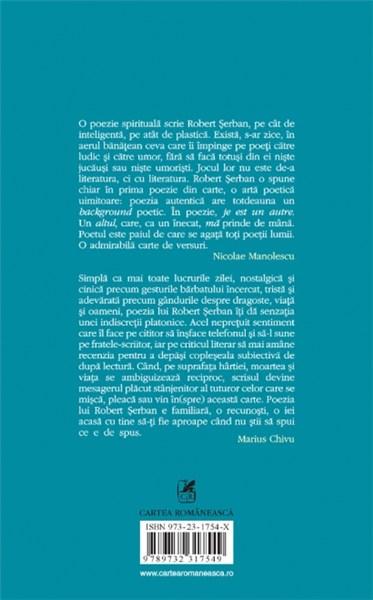 „Simpla ca mai toate lucrurile zilei, nostalgica si cinica precum gesturile barbatului incercat, trista si adevarata precum gindurile despre dragoste, viata si oameni, poezia lui Robert Serban iti da senzatia unei indiscretii platonice. Acel nepretuit sentiment care il face pe cititor sa insface telefonul si sa-l sune pe fratele-scriitor, iar pe criticul literar sa mai amine recenzia pentru a depasi copleseala subiectiva de dupa lectura. Cind, pe suprafata hirtiei, moartea si viata se ambiguizeaza reciproc, scrisul devine mesagerul placut stinjenitor al tuturor celor care se misca, pleaca sau vin in(spre) aceasta carte. Poezia lui Robert Serban e familiara, o recunosti, o iei acasa cu tine sa-ti fie aproape cind nu stii sa spui ce e de spus.“ (Marius Chivu)