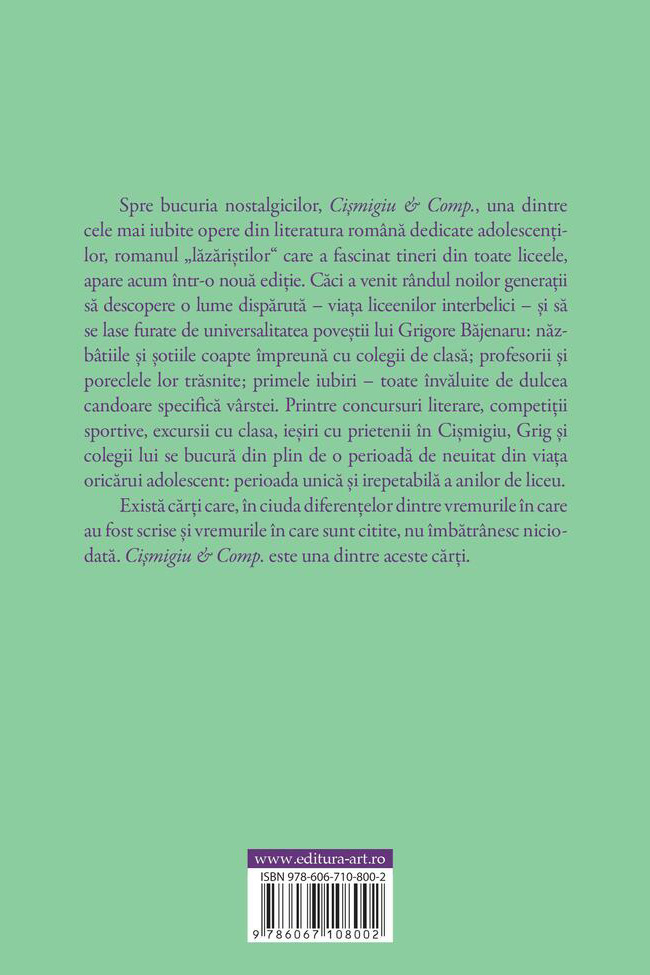 Spre bucuria nostalgicilor, Cişmigiu & Comp., una dintre cele mai iubite opere din literatura română dedicate adolescentilor, romanul "lăzăriştilor" care a fascinat tineri din toate liceele, apare acum într-o nouă ediție. Căci a venit rândul noilor generații să descopere o lume dispărută - viața liceenilor interbelici - și să se lase furate de universalitatea poveştii lui Grigore Băjenaru: năzbâtiile şi șotiile coapte împreună cu colegii de clasă; profesorii și poreclele lor trăsnite; primele iubiri - toate învăluite de dulcea candoare specifică vârstei. Printre concursuri literare, competiții sportive, excursii cu clasa, ieșiri cu prietenii în Cișmigiu, Grig și colegii lui se bucură din plin de o perioadă de neuitat din viața oricărui adolescent: perioada unică și irepetabilă a anilor de liceu.
