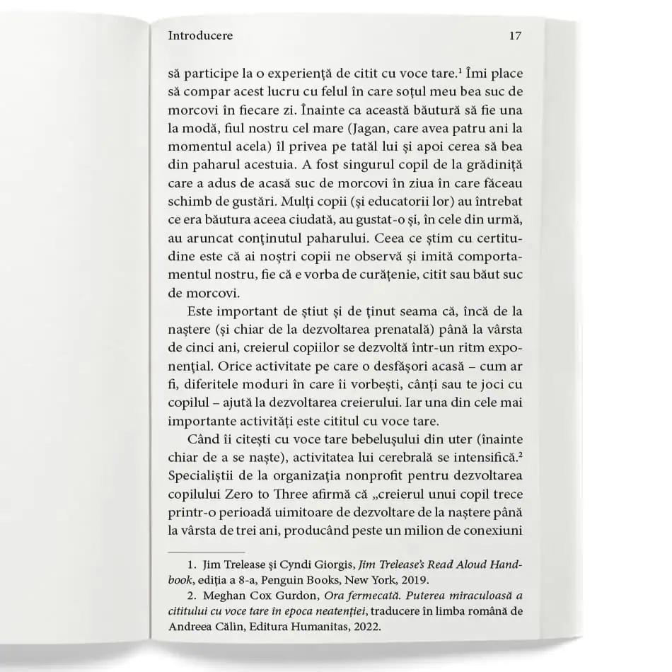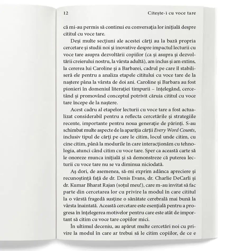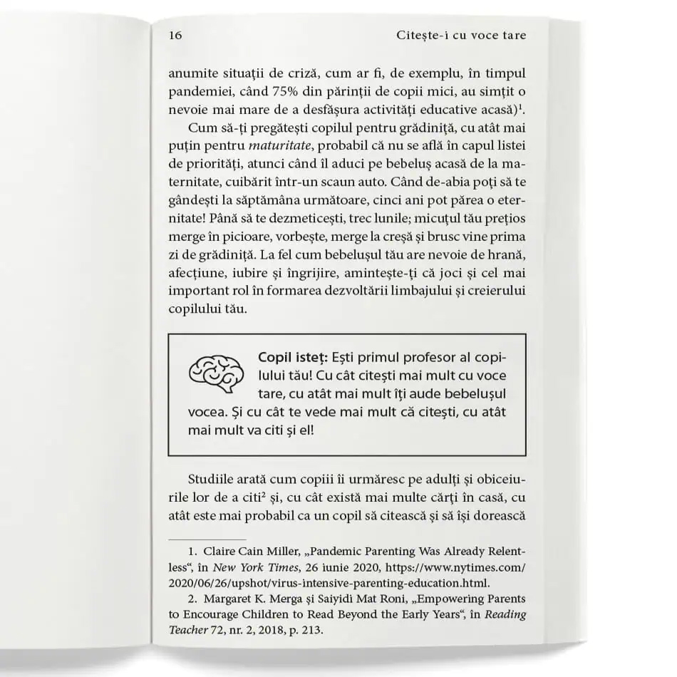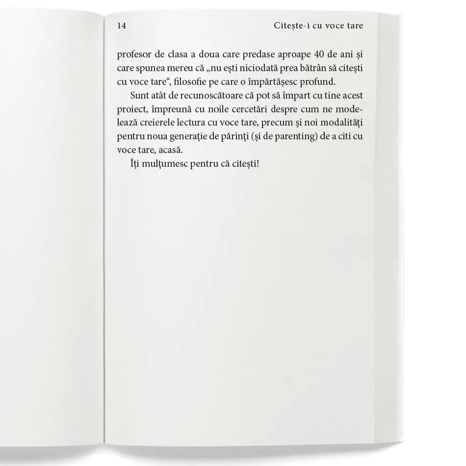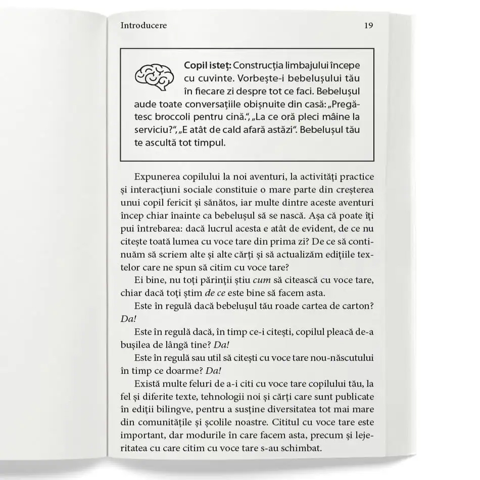 „Limbajul e gândire. Părinții care le citesc copiilor de mici, care folosesc în comunicarea cu ei mai mult decât vorbirea pur administrativă, care știu să trezească zâmbete de la două luni prin onomatopee, cântece și articulări de rime strâns corelate cu privirea ochi-în-ochi, sunt părinții care asigură primul pas către excelență. Cititul reconfigurează mintea, transformând-o permanent într-o hartă care câștigă noi și noi dimensiuni. Mintea obișnuită cu cititul este mai spectaculoasă decât universul în sine. E o forță vie, care are mereu și mereu capacitatea de a dărui viață și vitalitate în jur, care creează și reordonează lumi. Cartea de față ne convinge și ne ajută pe toți să îndrăznim să deschidem mintea copiilor către aceste infinite lumi: să practicăm cititul cu voce tare ca pe o sursă nesfârșită de creștere a intelectului lor, ca pe o cheie a dezvoltării minții încă de dinainte de naștere. Este un ghid excelent, dar și un antrenor mereu plin de energie, mereu încurajator; un tovarăș convingător, care ne veghează să ne ținem cu toții de treabă, părinți și profesori, cu grija să nu cumva să ratăm un instrument atât de la îndemână și atât de miraculos.“ — Oana Moraru, fondatoarea școlii Helikon și autoarea cărții Copilul tău citește