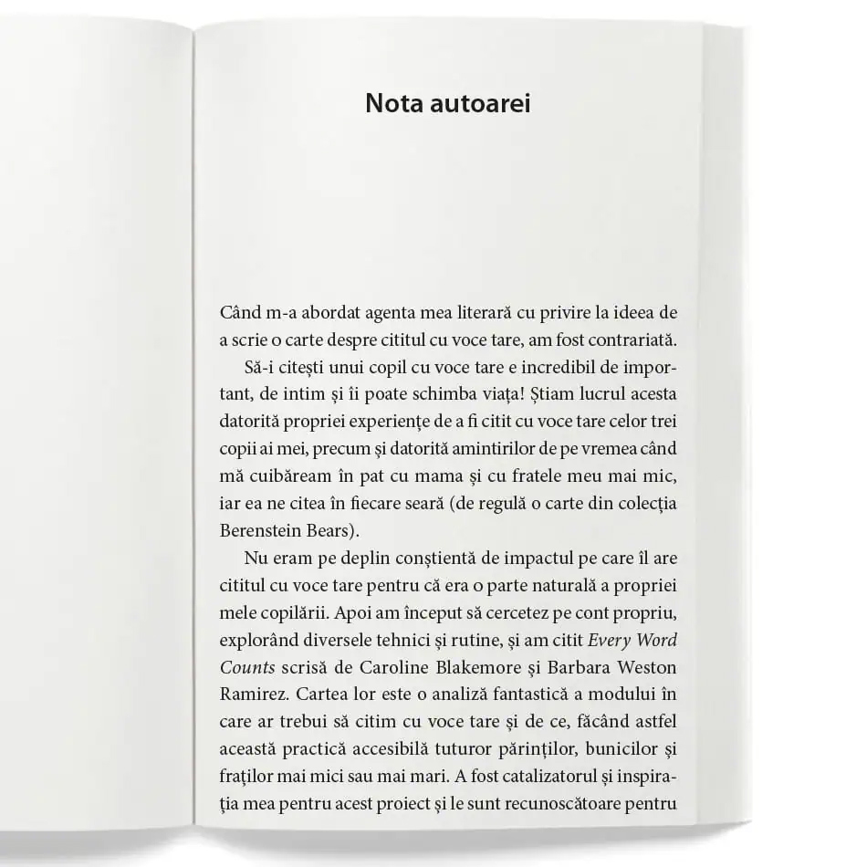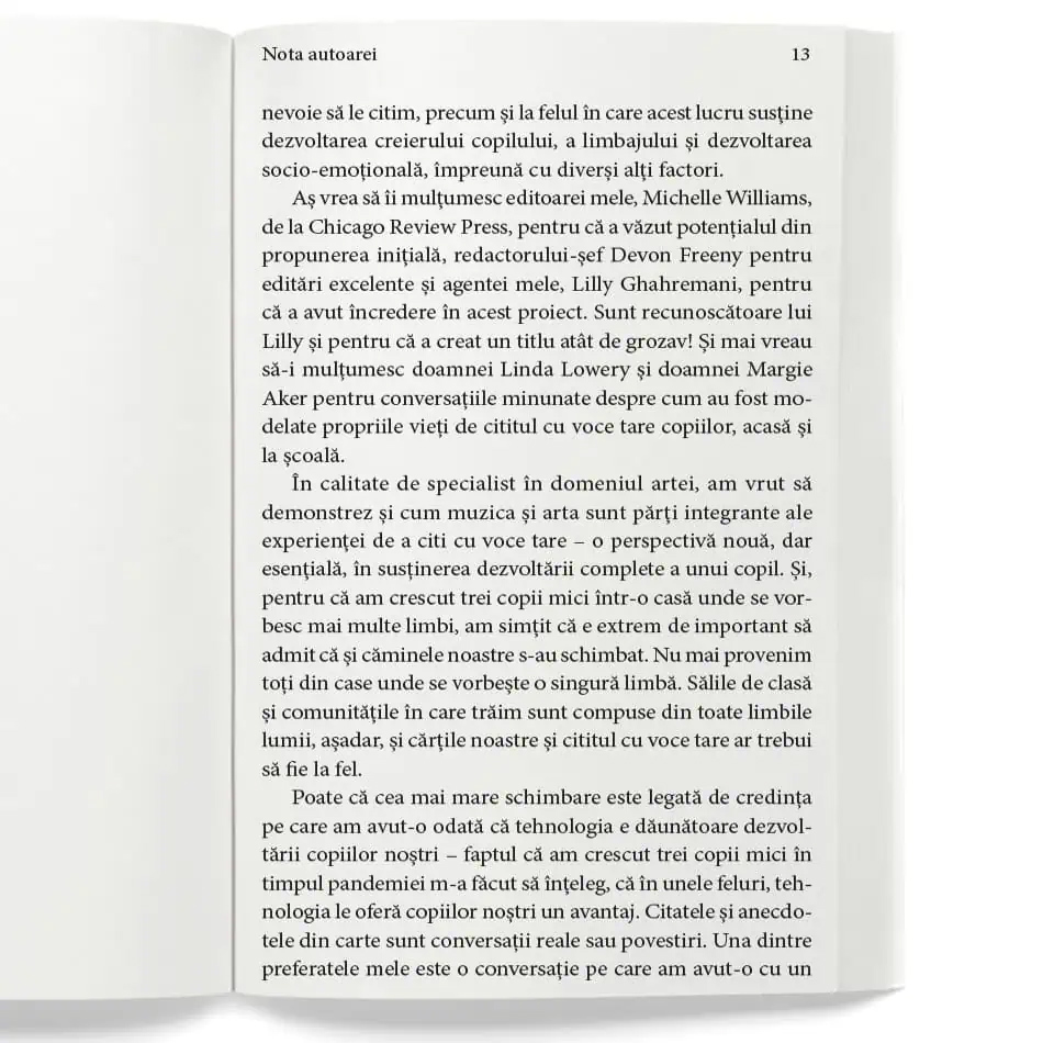 Cartea este structurată în trei părți clare și accesibile. Prima secțiune explică de ce este important să le citim copiilor cu voce tare și detaliază impactul acestui gest asupra dezvoltării creierului, limbajului și echilibrului emoțional. Partea a doua descrie cele șase etape ale lecturii, de la perioada prenatală până la vârsta școlară. Iar ultima secțiune oferă sugestii practice despre cum putem integra muzica, arta și tehnologia în momentele de lectură împărtășite.