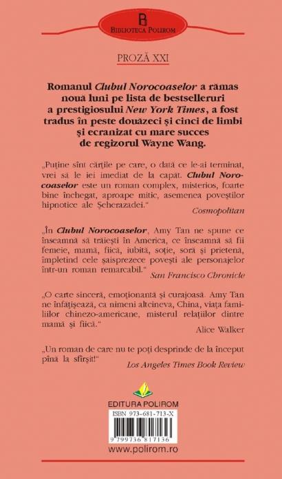 Romanul imbina povestile mai multor femei, mame si fiice, explorind tensiunile si, deopotriva, relatiile puternice dintre generatii. Dureroase, tandre, misterioase si profund emotionante, povestile personajelor se desprind dintr-una intr-alta, fermecindu-si cititorul. Romanul Clubul norocoaselor a ramas opt luni pe lista de bestselleruri a prestigioasei publicatii New York Times si a fost tradus in peste douazeci si cinci de limbi. Cartea a fost nominalizata la National Book Award si National Book Critics Circle Award si a fost distinsa cu Bay Area Book Reviewers Award for Fiction si Commonwealth Club Gold Award. Clubul norocoaselor a fost ecranizat cu mare succes in anul 1993 de regizorul Wayne Wang.