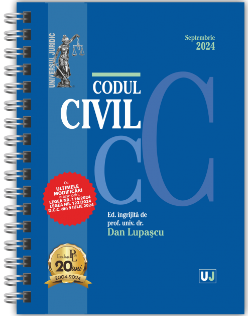 Lucrarea Codul civil Septembrie 2024 (editie spiralata), ingrijita de prof. univ. dr. Dan Lupascu si tiparita pe hartie alba de calitate superioara, include ultimele modificari aduse prin: Legea nr. 116/2024; Legea nr. 122/2024; D.C.C. din 9 iulie 2024.