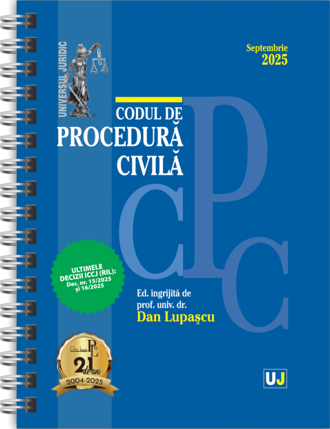 Lucrarea Codul de procedura civila Septembrie 2025 (editie spiralata), tiparita pe hartie alba de calitate superioara si ingrijita de prof. univ. dr. Dan Lupascu, contine textul Codului de procedura civila actualizat, imbogatit cu dispozitii de aplicare, decizii ale Curtii Constitutionale, DECIZII ICCJ (RIL) – inclusiv Dec. nr. 15/2025 si 16/2025, hotarari prealabile, TAXE JUDICIARE DE TIMBRU (extrase din O.U.G. nr. 80/2013), NUMEROASE DISPOZITII CONEXE si referinte legislative deosebit de utile.
