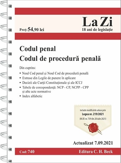 Noua ediție a culegerii conţine atât Codul penal şi Codul de procedură penală consolidate la zi, cât şi extrase din Legile pentru punerea în aplicare a acestora, fiind incluse şi modificările aduse prin Legea nr. 130/2021 pentru modificarea și completarea Legii nr. 135/2010 privind Codul de procedură penală (M.Of. nr. 493 din 12 mai 2021); Legea nr. 146/2021 privind monitorizarea electronică în cadrul unor proceduri judiciare și execuțional penale (M.Of. nr. 515 din 18 mai 2021); Legea nr. 186/2021 pentru modificarea și completarea Legii nr. 286/2009 privind Codul penal (M.Of. nr. 657 din 2 iulie 2021); Legea nr. 207/2021 pentru modificarea și completarea Legii nr. 286/2009 privind Codul penal, precum și pentru dispunerea unor măsuri de transpunere a Directivei (UE) 2019/713 a Parlamentului European și a Consiliului din 17 aprilie 2019 privind combaterea fraudelor și a contrafacerii în legătură cu mijloacele de plată fără numerar și de înlocuire a Deciziei-cadru 2001/413/JAI a Consiliului (M.Of. nr. 720 din 22 iulie 2021); Legea nr. 219/2021 pentru modificarea și completarea Legii nr. 104/2008 privind prevenirea și combaterea producerii și traficului ilicit de substanțe dopante cu grad mare de risc (M.Of. nr. 739 din 28 iulie 2021).