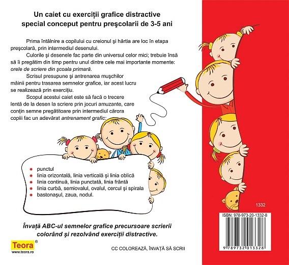 Acest caiet de lucru se adreseaza in principal prescolarilor, dar poate fi folosit si de catre copiii de clasa I: contine desene, jocuri si exercitii grafice cu ajutorul carora micutii: - invata regulile de scriere corecta - traseaza elemente grafice de baza (punct, linia orizontala, linia verticala si linia curba) - invata sa recunoasca literele de tipar - exerseaza trasarea literelor mari de tipar - exerseaza elementele grafice care compun literele de mana - fac cunoastinta cu alfabetul - invata sa scrie cifre si cuvinte scurte, compuse din cateva litere - se familiarizeaza cu liniatura caietelor de clasa I - deseneaza, coloreaza, numara si rezolva jocuri care necesita atentie si indemanare.