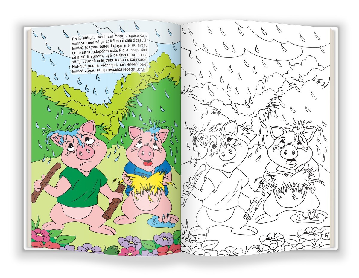 Povestea celor trei purceluși, într-un format cu multiple beneficii: fiecare scenă din poveste, cu text și ilustrație color, are un desen-pereche, ce trebuie colorat.