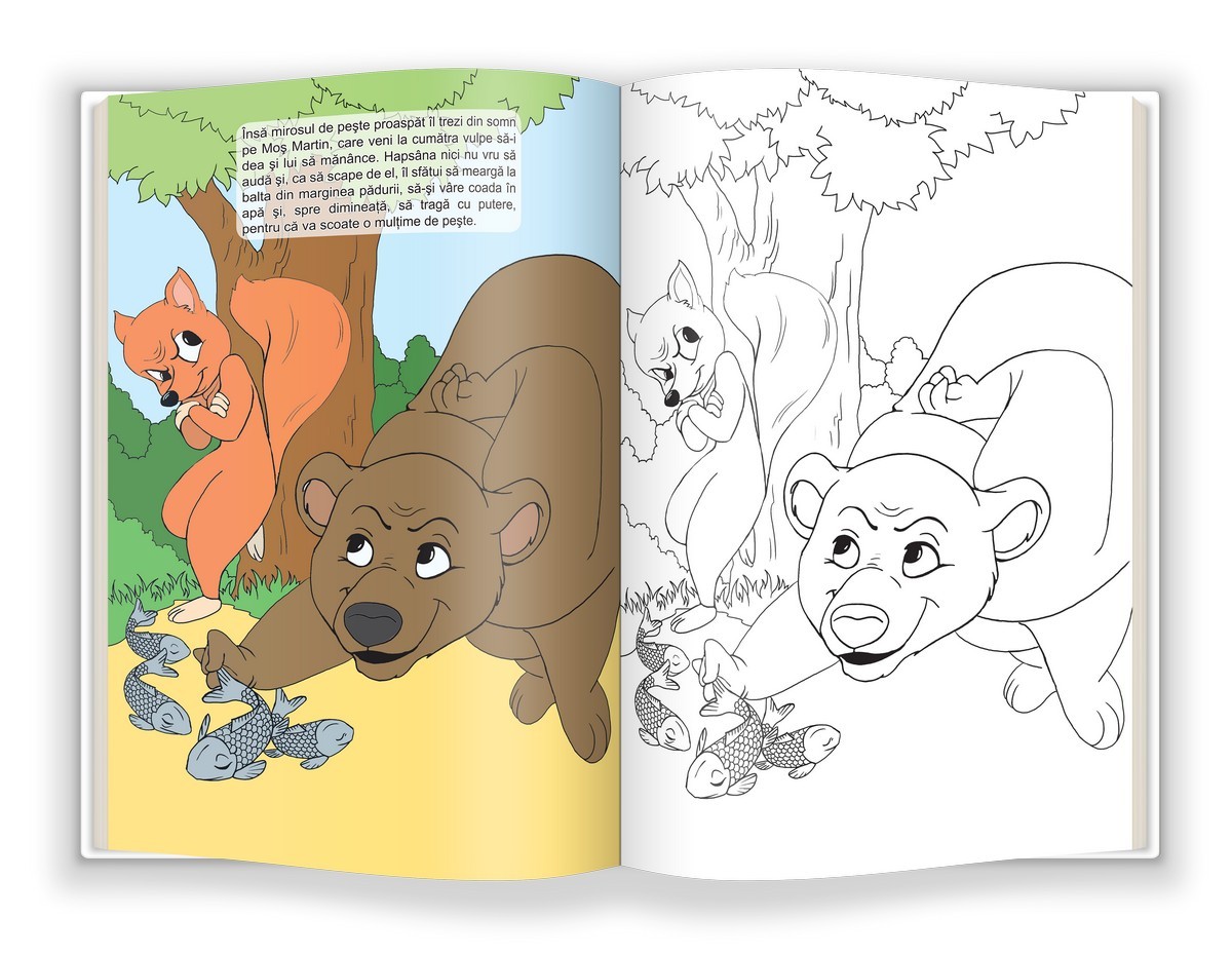 Povestea ursului păcălit de vulpe, într-un format cu multiple beneficii: fiecare scenă din poveste, cu text și ilustrație color, are un desen-pereche, ce trebuie colorat.