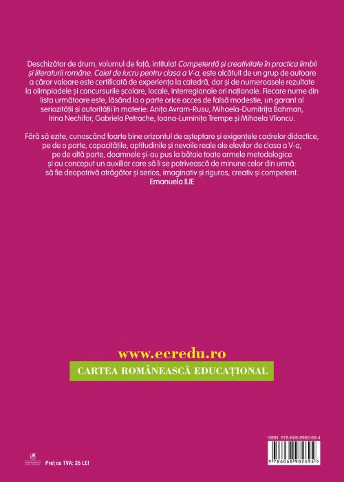 Deschizător de drum, prin urmare, auxiliarul de față, intitulat Competență și creativitate în practica limbii și literaturii române. Caiet de lucru pentru clasa a V-a, este alcătuit de un grup de autoare a căror valoare este certificată de experiența la catedră, dar și de numeroasele rezultate la olimpiadele și concursurile școlare, locale, interregionale ori naționale. Fiecare nume din lista următoare este, lăsând la o parte orice acces de falsă modestie, un garant al seriozității și autorității în materie: Anița Avram-Rusu, Mihaela-Dumitrița Bahman, Irina Nechifor, Gabriela Petrache, Ioana-Luminița Trempe și Mihaela Vlioncu.