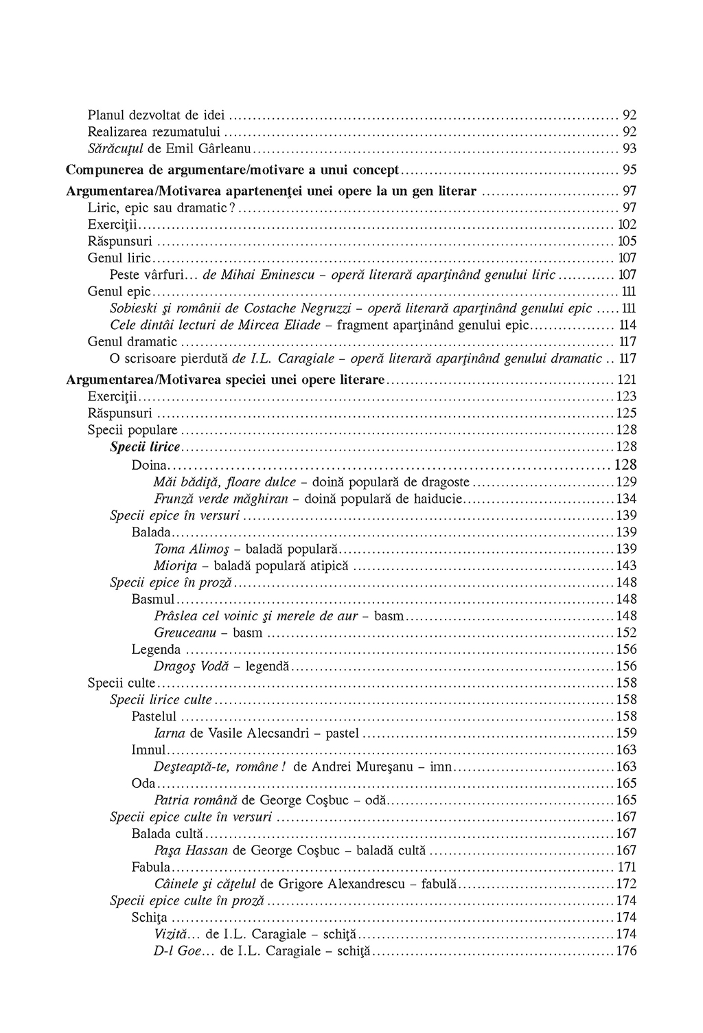 Volumul conține îndrumări eficiente privind realizarea tuturor tipurilor de compuneri prevăzute de actuala programă școlară, înțelegerea tipului de compunere, echilibrarea părților componente, principiile și regulile ce trebuie respectate, elementele de compoziție și structură (titlul, corpul textului, paragraful), calitățile pe care trebuie să le aibă o compunere (coerența, logica, unitatea, claritatea, precizia, concizia, corectitudinea, proprietatea termenilor) și normele de redactare. Noua ediție propune strategii de structurare a planului și a diferitelor tipuri de compuneri, organizatori textuali, marcatori de relație, conectori logici, cîmpuri lexicale adecvate fiecărei compuneri. Numeroasele exerciții și exemple practice care însoțesc expunerile teoretice contribuie la formarea unui limbaj adecvat și la dezvoltarea competenței de structurare și redactare a compunerilor.