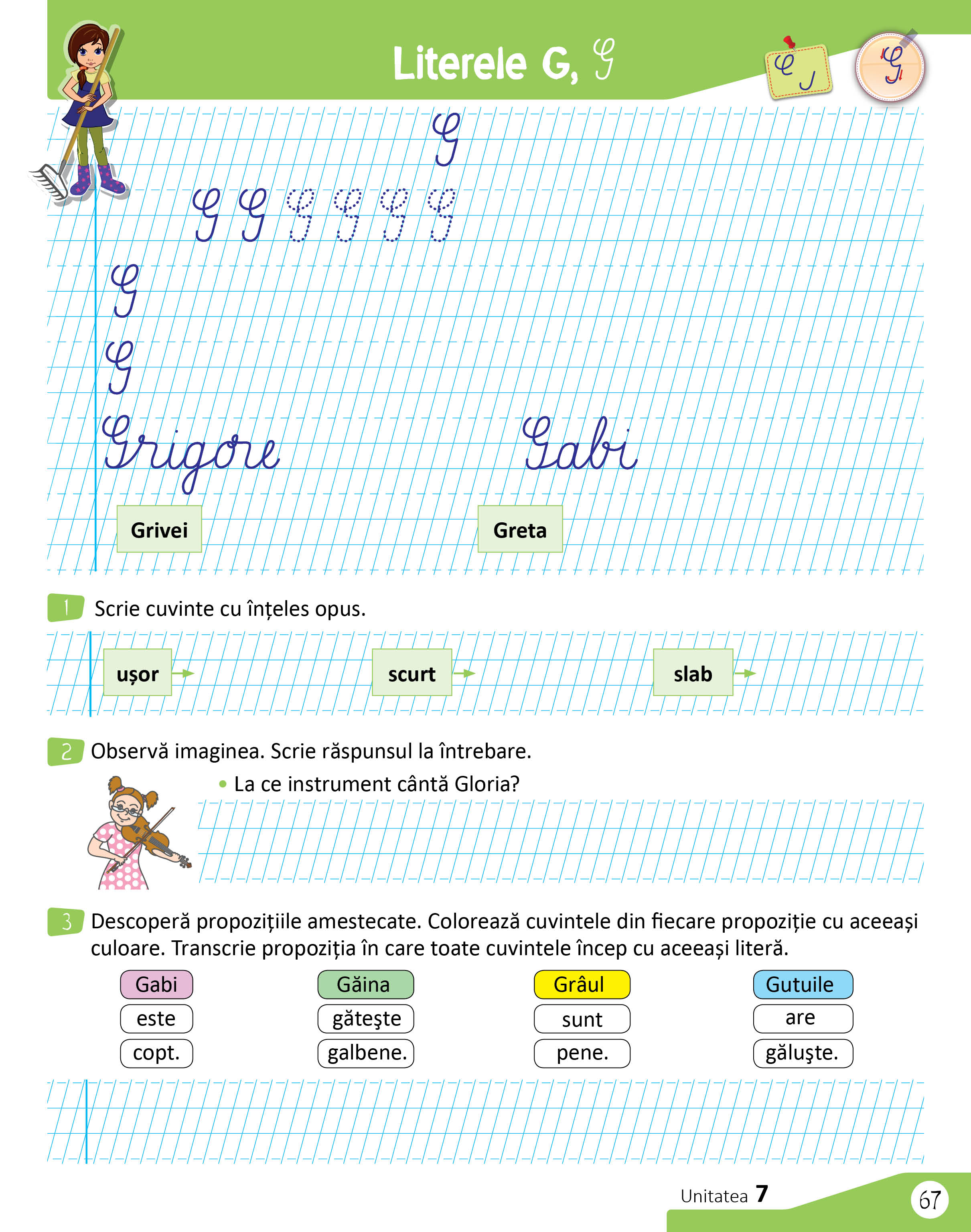 Prin conţinutul său, caietul este un instrument de lucru util și atractiv pentru aprofundarea cunoștințelor de citit-scris. Sarcinile de lucru dezvoltă, în principal, deprinderi de scriere corectă și caligrafică, capacitatea elevilor de a exprima în scris idei și sentimente, dar oferă și contexte de exersare a actului citirii, de îmbogăţire a vocabularului. Sarcinile de lucru sunt atractive, au grade diferite de dificultate, oferă contexte multiple și variate de exersare a scrisului, de automatizare a citirii și de conștientizare a conținutului citit. Jocurile au o pondere semnificativă și oferă posibilitatea realizării transferului către alte discipline.