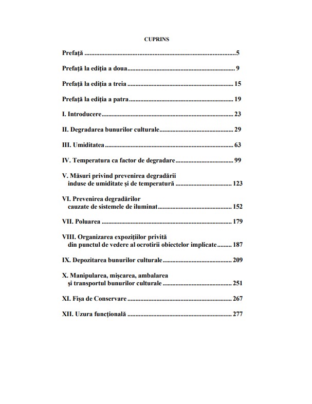 Rostul acestei lucrări are o ţintă precisă: să fie un ghid pentru toţi cei care în muzee, biblioteci, centre de cultură răspund de starea patrimoniului: muzeografi deopotrivă cu conservatori, restauratori cu cei care conduc aceste instituţii. Lucrarea-şi propune să fie în primul rând un instrument de lucru, cât mai complet cu putinţă, care să folosească celor interesaţi şi în care aceştia să găsească răspunsuri foarte numeroaselor probleme pe care le ridică păstrarea bunurilor culturale.