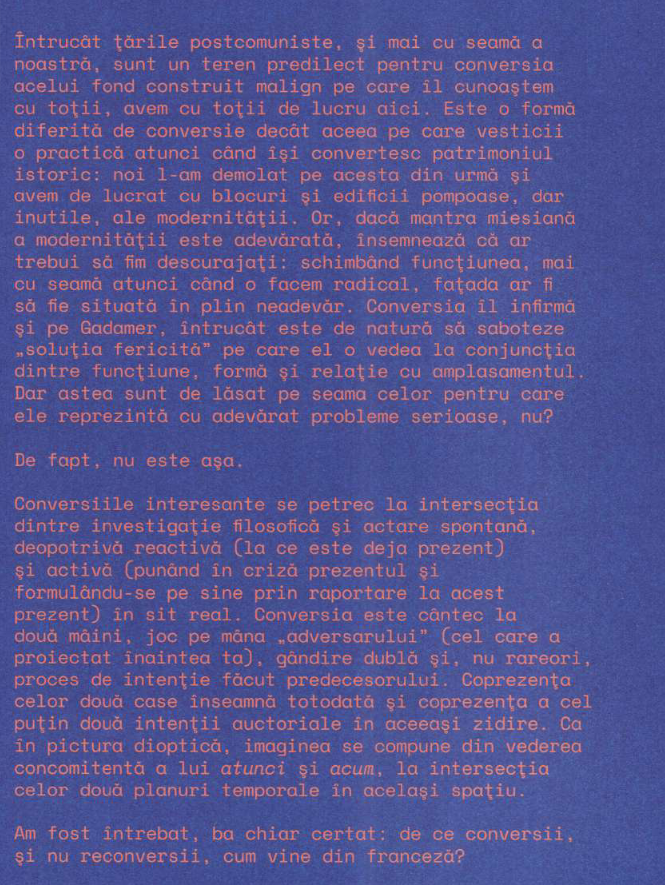 Conversii. Carte-laborator e o aparitie editoriala inedita ce ilustreaza exemple contemporane de conversie arhitecturala din Romania, in care cladiri din patrimoniul industrial, religios, militar, comercial au fost readaptate si revalorificate printr-o dimensiune culturala si artistica: Atelierele Malmaison, Casa Tranzit, Atelierele Scanteia, FABER, La Centrala (Slanic-Moldova), The Ark, Baia Turceasca, Bastionul Theresia, ARCUB, Palatul Universul si MultipleXity (MX), alaturi de 2 studii de caz dedicate unor initiative cu statut aparte, Mina ("Planeta") Petrila si Fabrica de Pensule din Cluj-Napoca.
