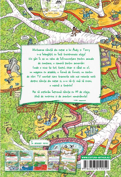 Vei găsi în ea un salon de înfrumusețare pentru animale de companie, o cameră pentru aniversări (unde e ziua ta tot timpul, chiar și când nu e), un magazin cu acadele, o fermă de furnici, un centru de știri TV nonstop care transmite cele mai recente vești despre căsuța din copac și, n-o să-ți vină să crezi, o mașină a timpului!