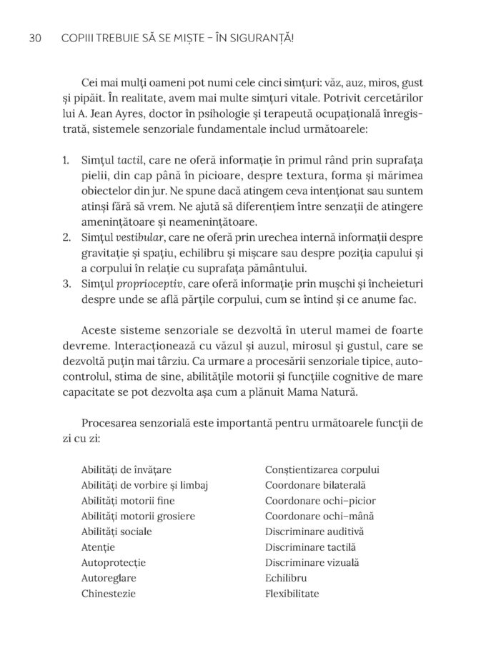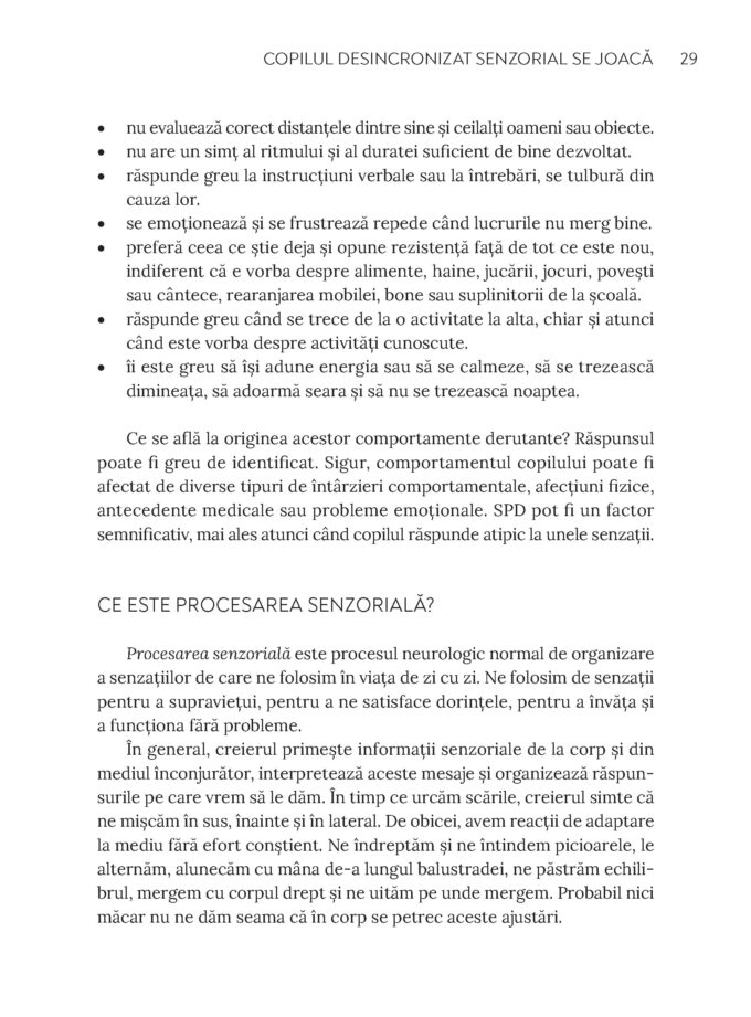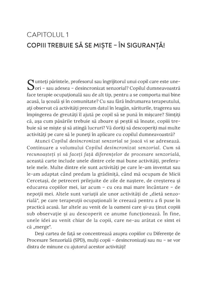 Fiecare activitate ajută la dezvoltarea și organizarea creierului și corpului copiilor. Indiferent de provocările cu care se confruntă copilul (atingere, echilibru, mișcare, poziția corpului, vedere, auz, miros, gust, planificare motorie sau alte probleme senzoriale), în cartea Copilul desincronizat senzorial se joacă veți găsi modalități vii și captivante de a integra distracția și jocul în situațiile de zi cu zi.