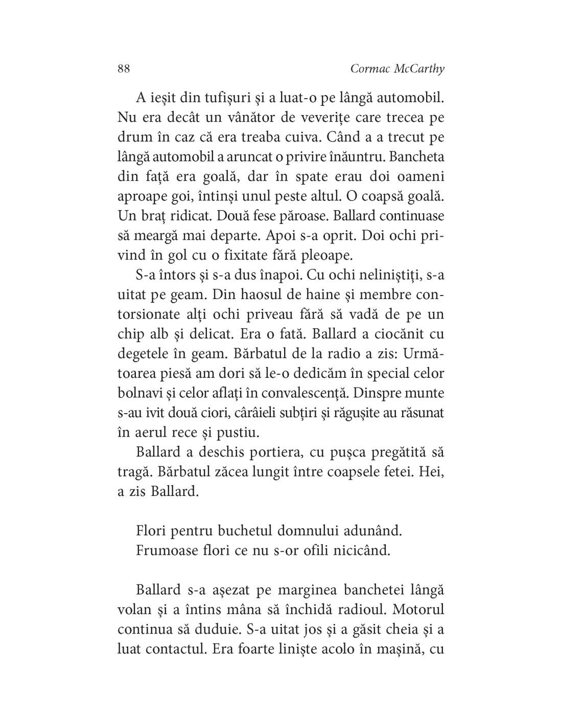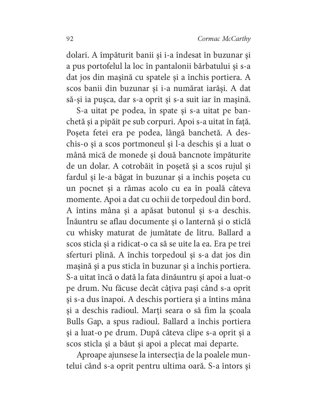 „Asemenea romancierilor pe care îi admiră – Melville, Dostoievski, Faulkner –, Cormac McCarthy a creat o operă a imaginaţiei mai impunătoare şi mai profundă decât fiecare dintre cărţile sale în parte. Astfel de scriitori se luptă cu înşişi zeii.” (The Washington Post)