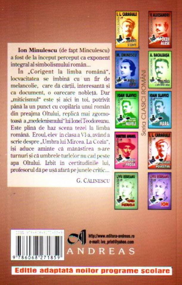 In "Corigent la limba romana", locvacitatea se imbina cu un fir de melancolie, care da cartii, interesanta si ca document, o oarecare nobleta. Dar "miticismul" este si aici in toi, potrivit pana la un punct cu copilaria unui roman in preajma Oltului, replica mai zgomotoasa a "medelenismului" lui Ionel Teodoreanu. Este plina de haz scena tezei la limba romana. Eroul, elev in clasa a VI-a, avand a scrie despre "Umbra lui Mircea. La Cozia", isi aduce aminte ca manastirea n-are turnuri si ca umbrele turlelor nu cad peste apa Oltului. Izbit in certitudinile lui, profesorul da pe usa afara pe junele critic...