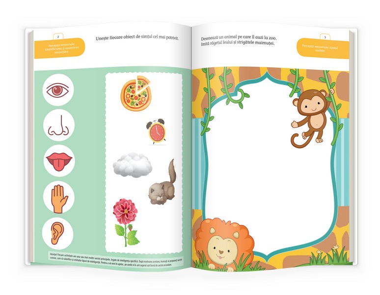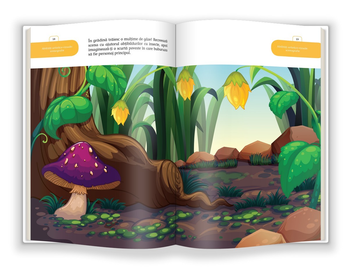 percepții senzoriale: simțul olfactiv, simțul auditiv • abilități artistico-vizuale: dactilopictură, pictură, trasare de contururi, colorare, finalizarea desenului, colaj, scenografie, modelaj • memorie vizuală • decorațiuni și arhitectură: origami • design vestimentar • inteligență vizuală: secvențiere, asociere, discriminare vizuală, modificări de perspectivă • inteligență muzical-ritmică: notele muzicale, gama Do major • creativitate în rezolvarea de probleme: raționament logic, folosirea indiciilor.