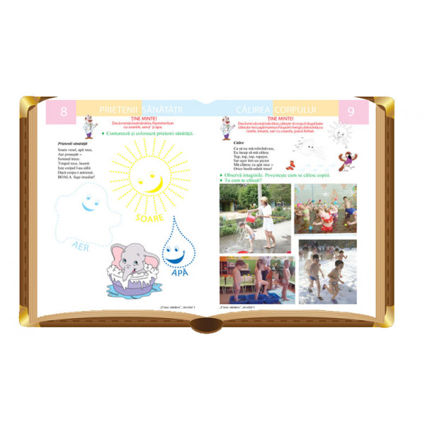 Educația pentru sănătate. Nivelul 1 conține: Informații despre corpul meu, despre importanța curățeniei și igienei, importanța sportului și mișcării, importanța alimentației, ghicitori, sfaturi înțelepte pentru copii, dar și pentru părinți... totul sub formă de joacă, pagini de colorat, desene amuzante și poezii distractive.