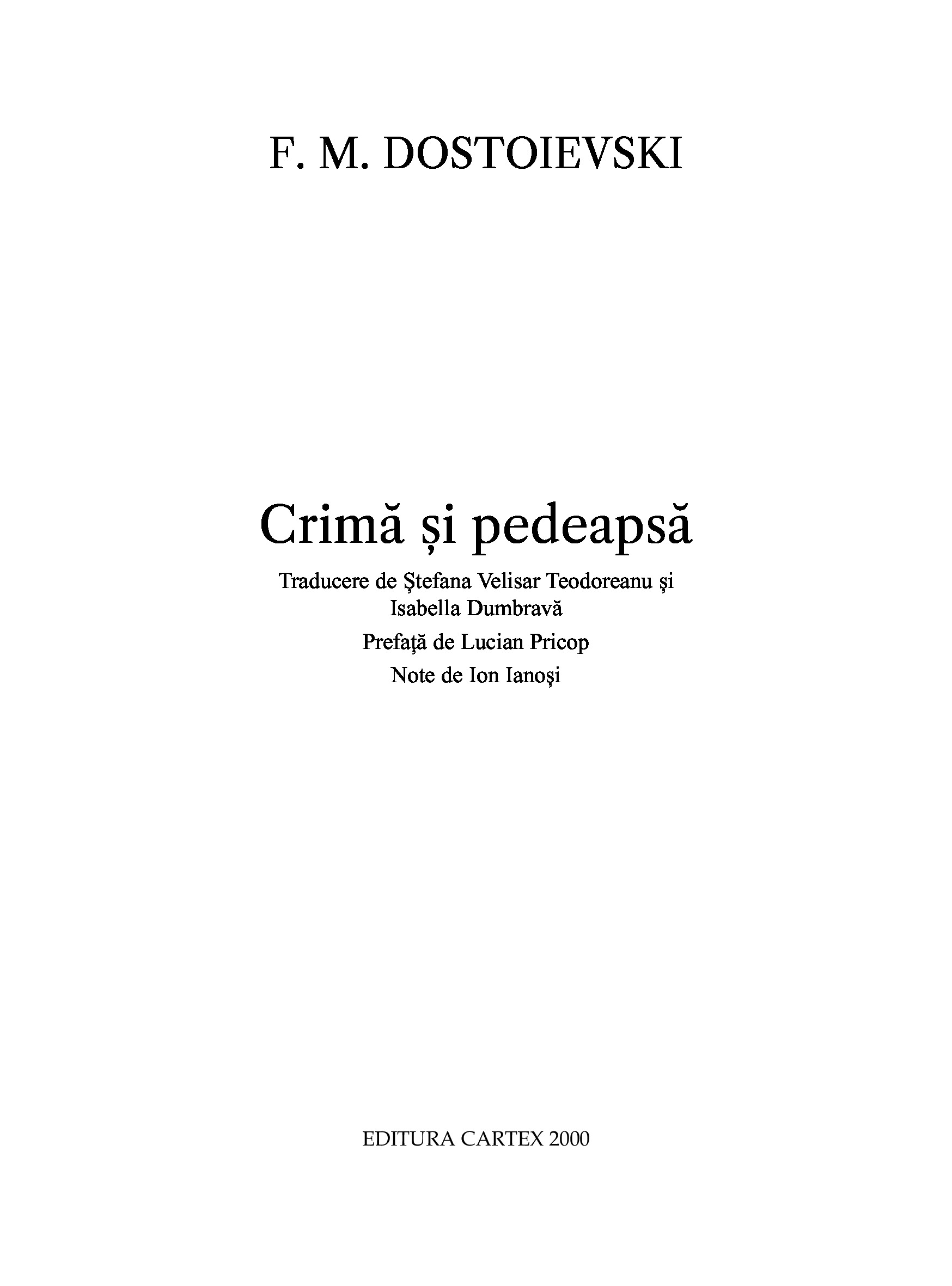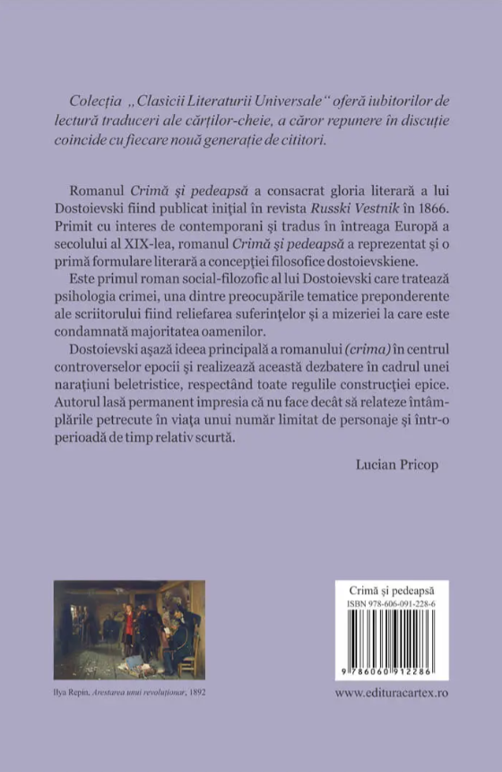 Romanul Crima si pedeapsa a consacrat gloria literara a lui Dostoievski fiind publicat initial in revista Russki Vestnik in 1866. Primit cu interes de contemporani si tradus in intreaga Europa a secolului al XIX-lea, romanul Crima si pedeapsa a reprezentat si o prima formulare literara a conceptiei filosofice dostoievskiene.
