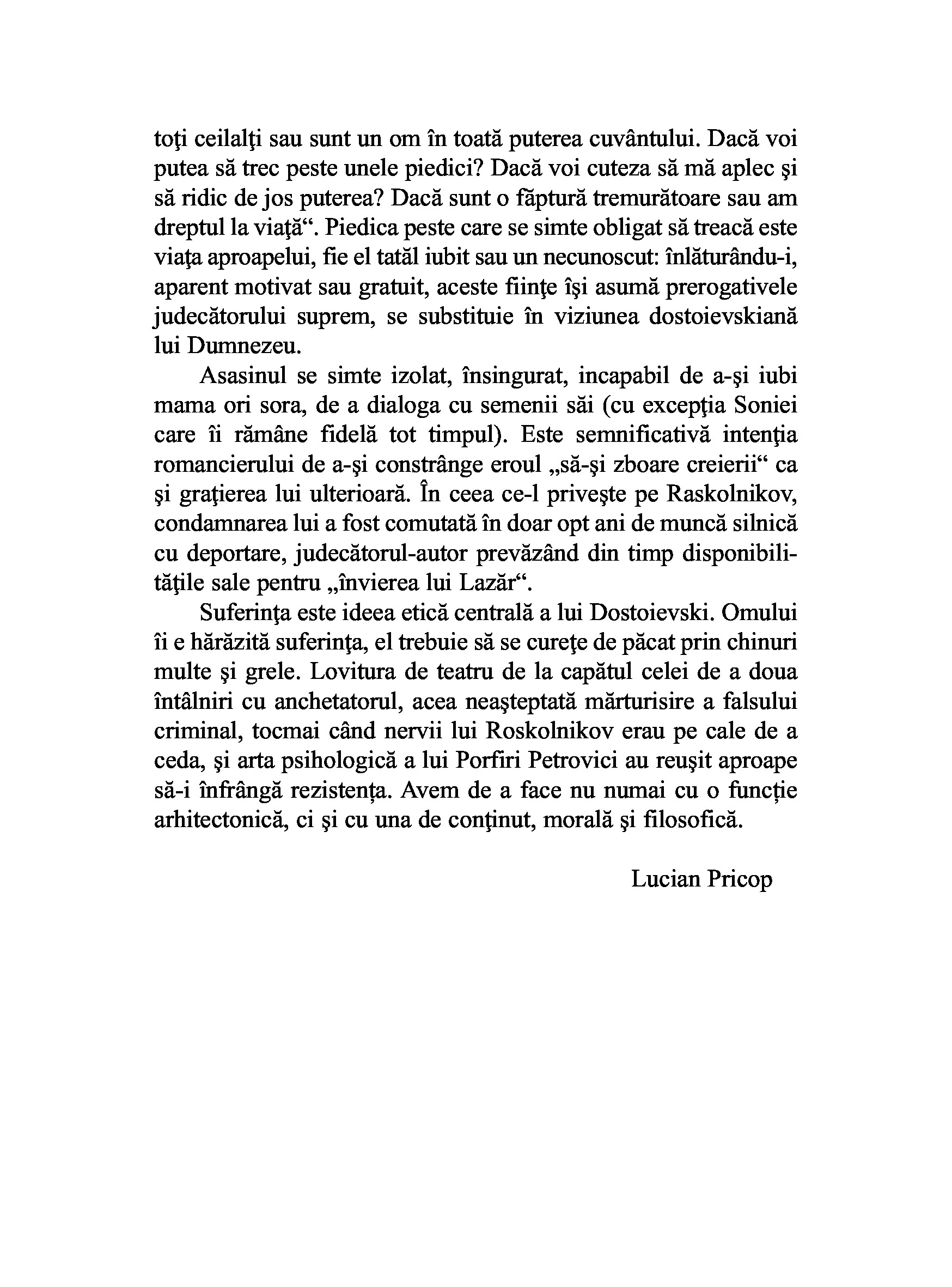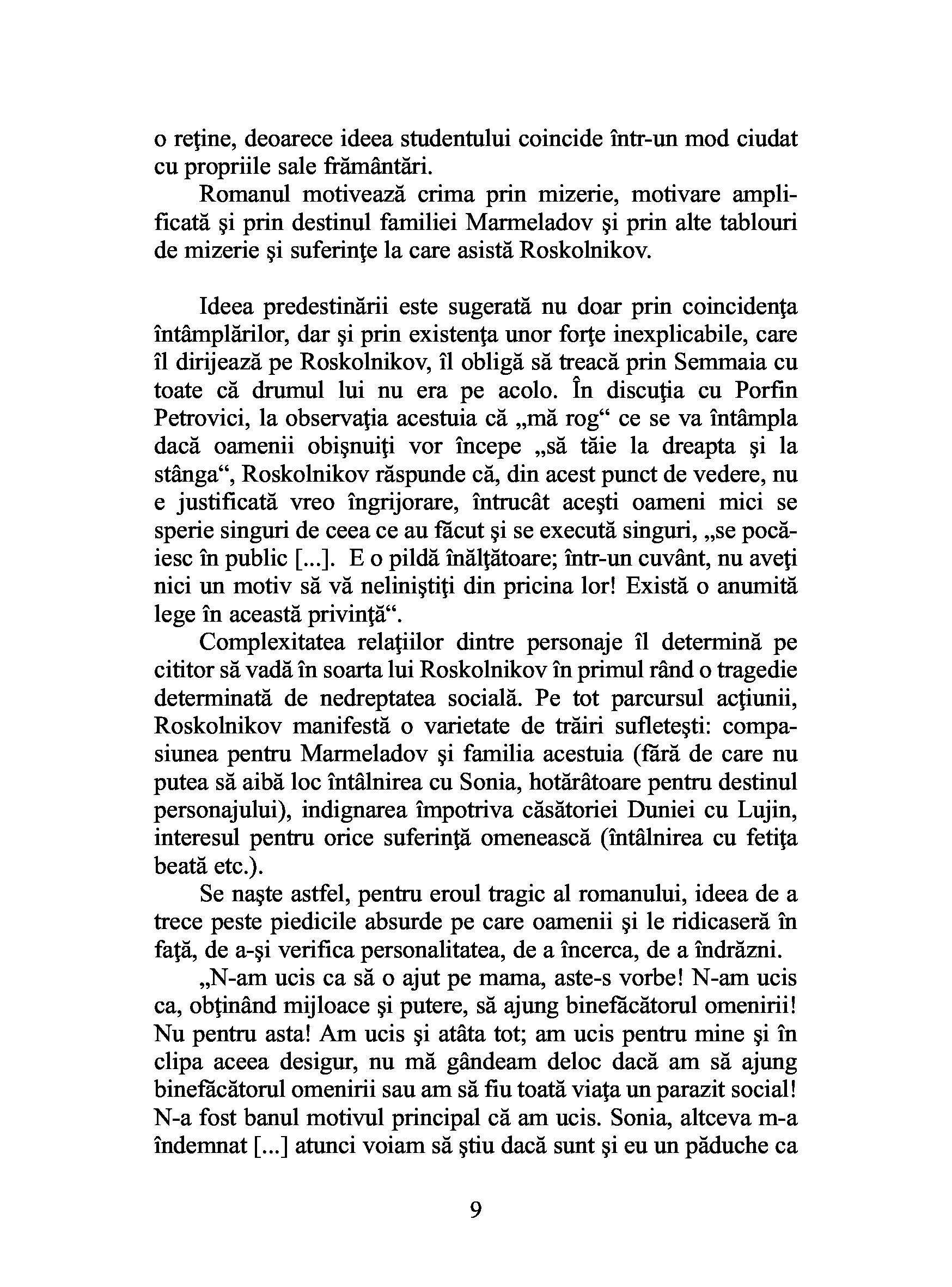 Dostoievski asaza ideea principala a romanului (crima) in centrul controverselor epocii si realizeaza aceasta dezbatere in cadrul unei naratiuni, respectand toate regulile constructiei epice, lasand permanent impresia ca nu face decat sa relateze intamplarile petrecute in viata unui numar limitat de personaje intr-o perioada de timp relativ scurta.