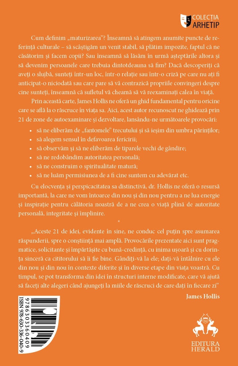 Prin aceasta carte, James Hollis ne ofera un ghid fundamental pentru oricine care se afla la o rascruce in viata sa. Aici, acest autor recunoscut ne ghideaza prin 21 de zone de autoexaminare si dezvoltare, lansandu-ne urmatoarele provocari: