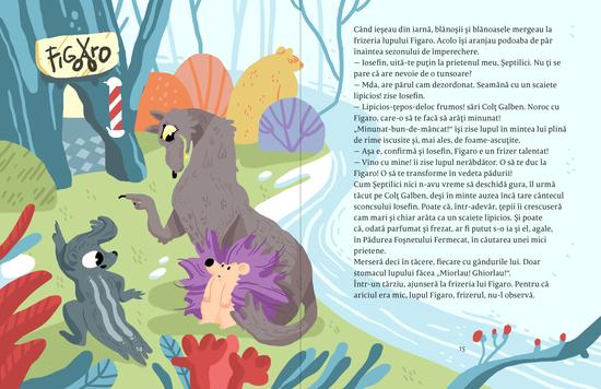 Lupul Colț Galben rătăcește prin pădure, căutând ceva cu care să-și potolească foamea. Când se întâlnește cu ariciul Șeptilici, îi încolțește în minte un plan prin care ar putea să-l transforme într-o pradă fără țepi, numai bună de mâncat. O poveste plină de umor, jocuri de cuvinte și rime care-i vor însoți pe copii și după ce au terminat de citit cartea.