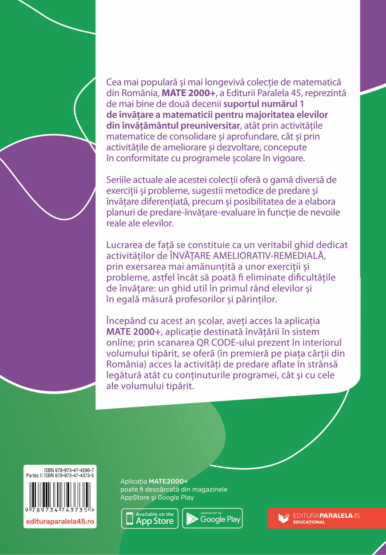 Cea mai populară şi mai longevivă colecţie de matematică din România, MATE 2000+, a Editurii Paralela 45, reprezintă de mai bine de două decenii suportul numărul 1 de învăţare a matematicii pentru majoritatea elevilor din învăţământul preuniversitar, atât prin activităţile matematice de consolidare şi aprofundare, cât şi prin activităţile de ameliorare şi dezvoltare, concepute în conformitate cu programele şcolare în vigoare.