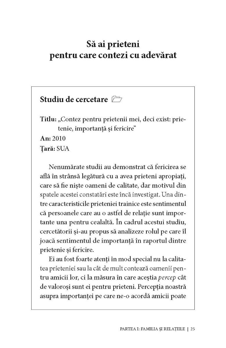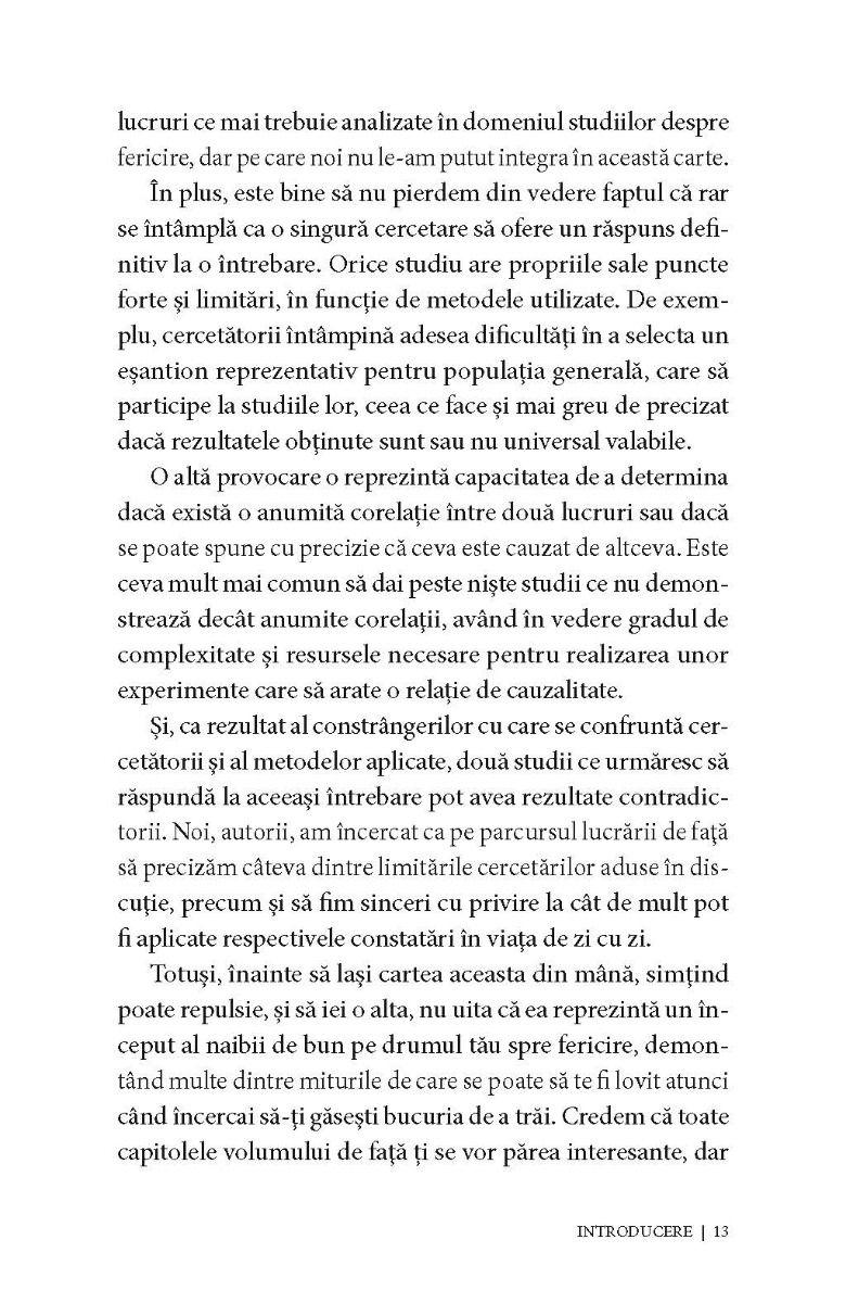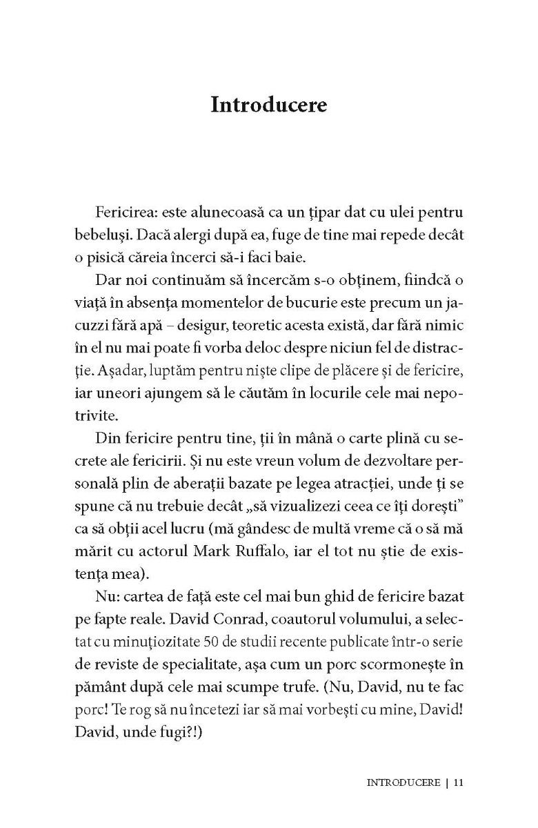 Actriţa britanică de comedie Ariane Sherine este hotărâtă să ne arate în această carte cum să descoperim adevărata cale spre o viaţă plină de fericire, iar David Conrad, coautorul lucrării de faţă şi expert în sănătate publică, pare că deţine secretul ei: cincizeci de studii atent alese care ne sugerează ce avem de făcut exact pentru a fi fericiţi în relaţia cu partenerul/partenera, cu prietenii, cu banii, în cea sexuală, dar și în carieră.