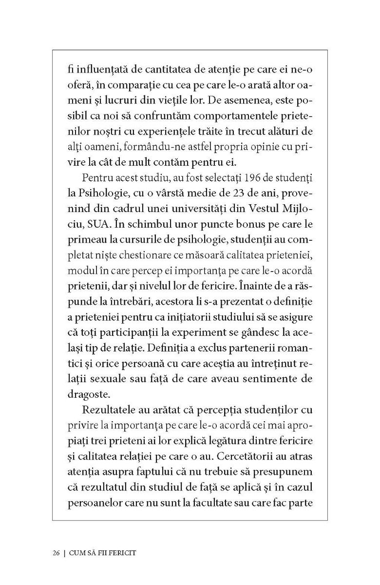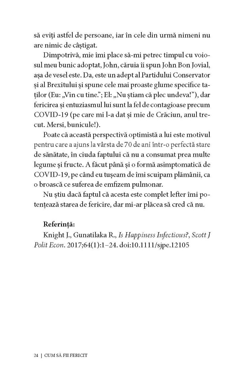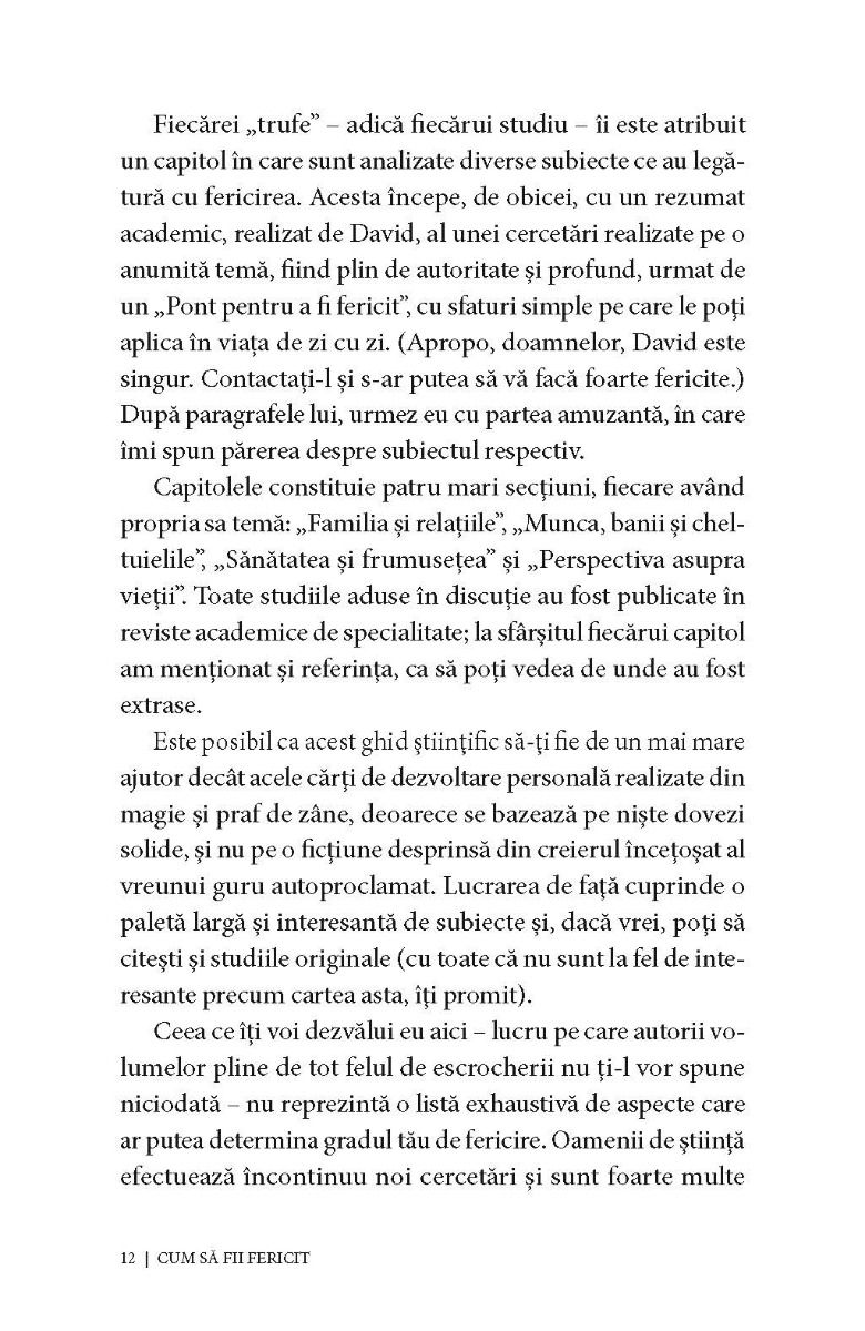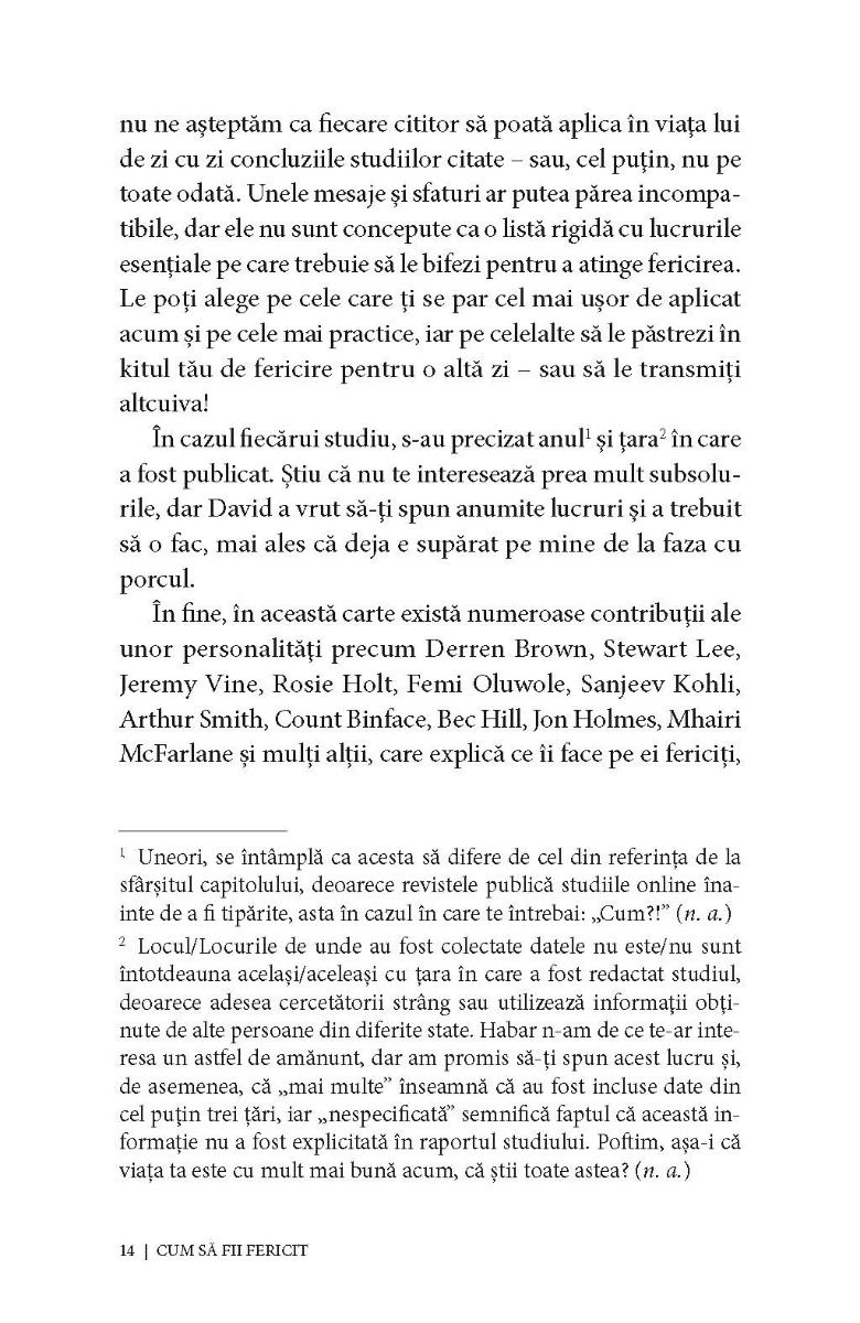 Actriţa britanică de comedie Ariane Sherine este hotărâtă să ne arate în această carte cum să descoperim adevărata cale spre o viaţă plină de fericire, iar David Conrad, coautorul lucrării de faţă şi expert în sănătate publică, pare că deţine secretul ei: cincizeci de studii atent alese care ne sugerează ce avem de făcut exact pentru a fi fericiţi în relaţia cu partenerul/partenera, cu prietenii, cu banii, în cea sexuală, dar și în carieră.