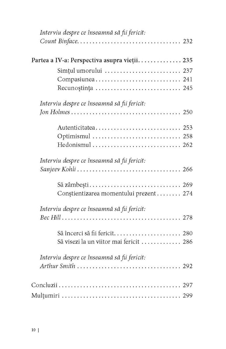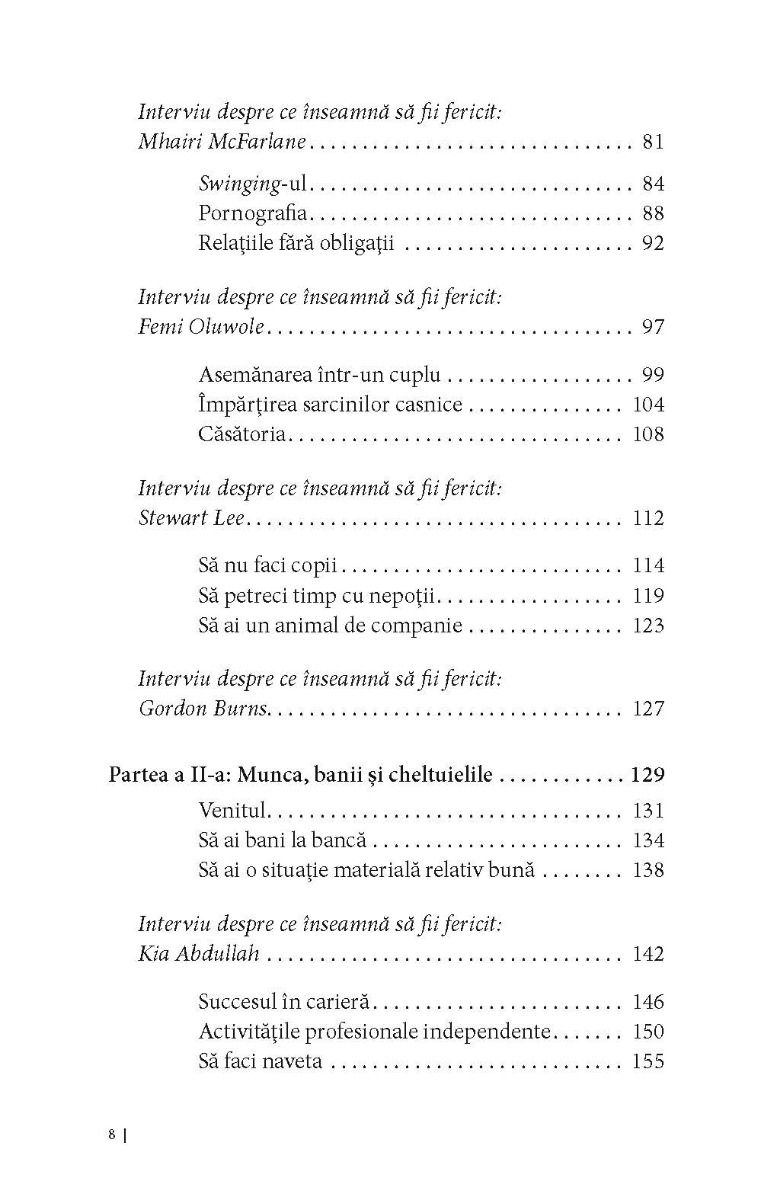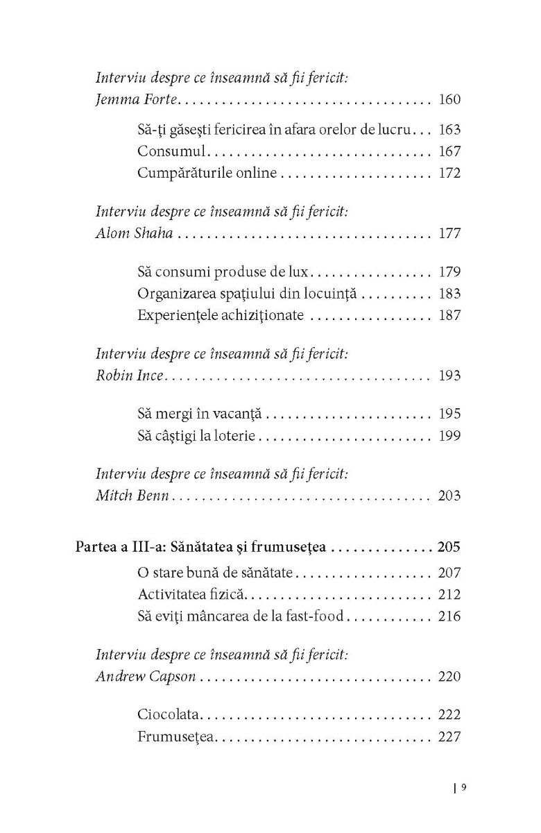 Această carte conţine toate datele, statisticile și umorul de care aţi putea avea nevoie ca să ajungeţi să duceţi o viață cu adevărat împlinită. O serie de celebrități din mass-media şi din showbiz își expun propria versiune despre ce înseamnă să fii o persoană fericită, astfel că citind lucrarea de faţă veţi afla de la acestea ce principii aţi putea extrage şi voi de aici ca să ajungeţi să vă bucuraţi de tot ce este bun şi frumos în viaţă.