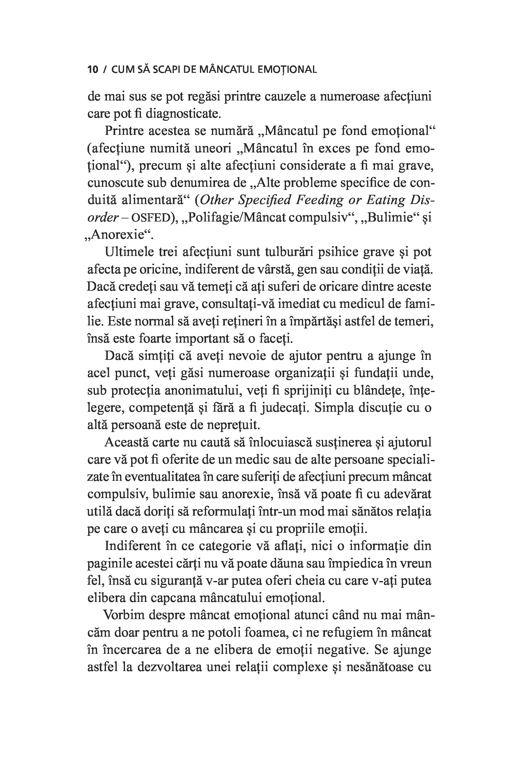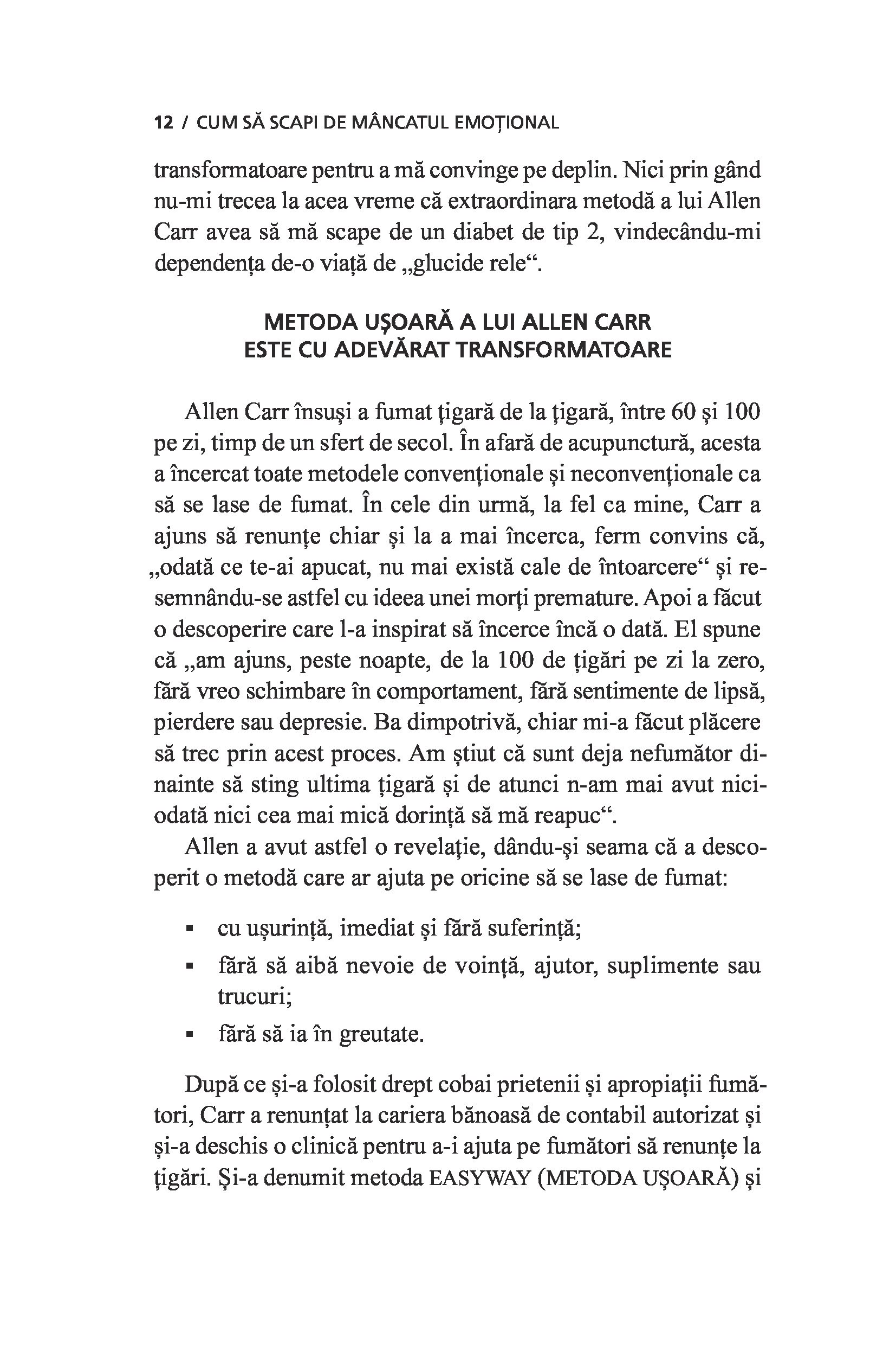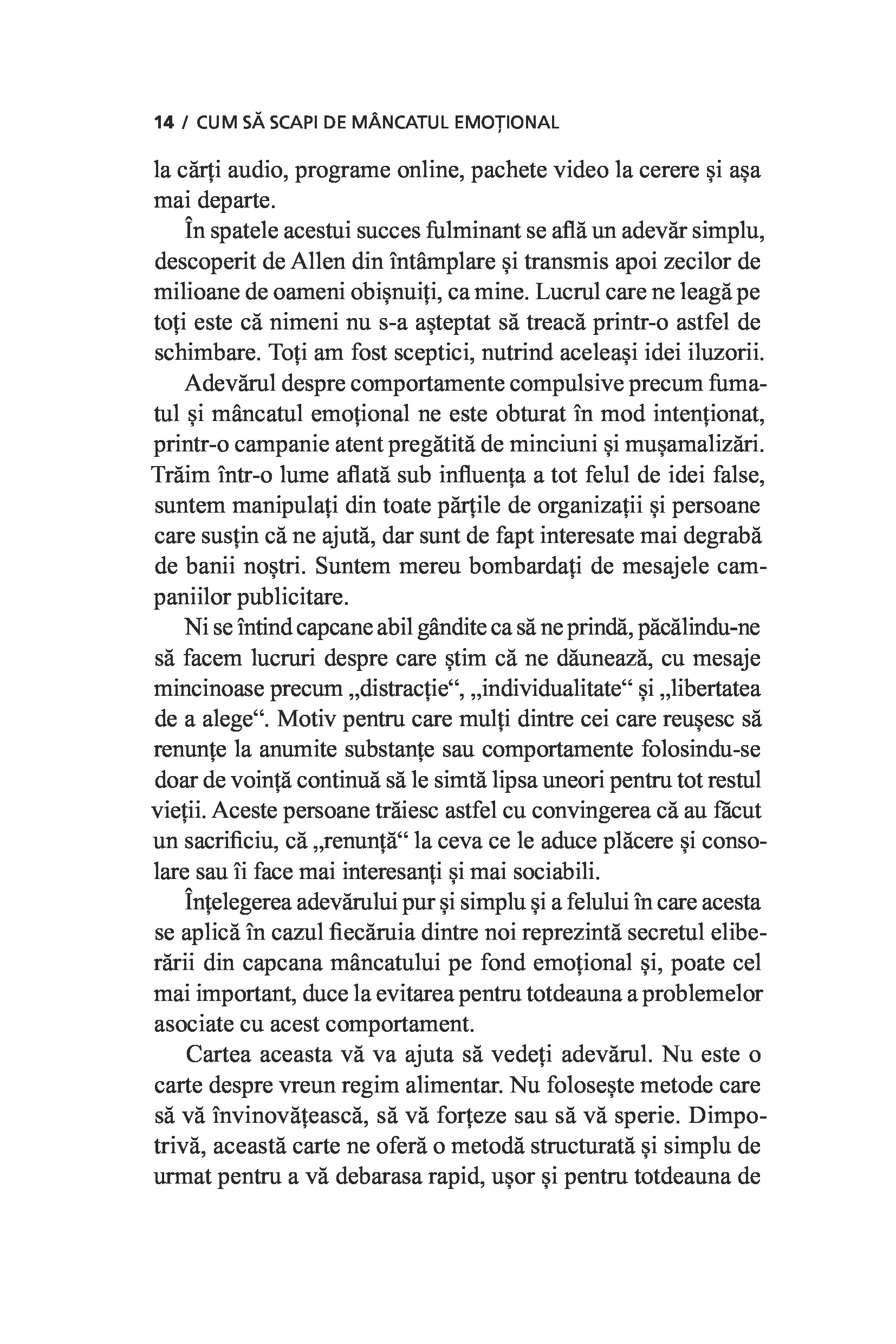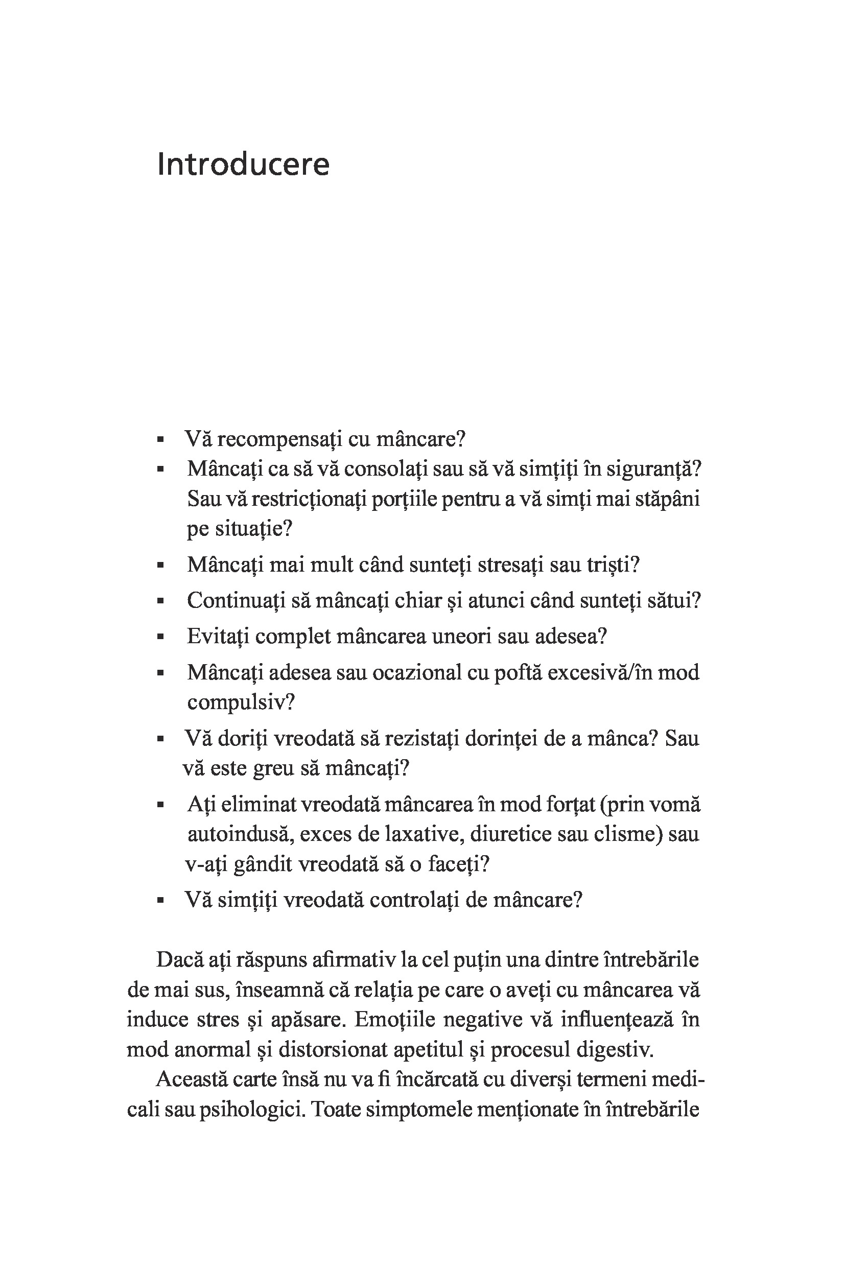 Această carte îți va spulbera toate iluziile despre mult râvnitele bunătăți de care ai ajuns să nu te mai saturi. De fapt, ele nu fac altceva decât să-ți adâncească insatisfacția, tristețea şi nemulțumirea de sine. În plus, sunt nesănătoase. Nici măcar nu au gust bun, așa cum ai fost păcălit să crezi. Încet, dar sigur ajung să pună stăpânire pe tine. Dacă te refugiezi în mâncat în orice situație din viața ta înseamnă că deja ai căzut în capcana mâncatului emoțional. Ajungi să crezi că doar un miracol te mai poate salva.