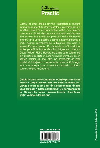 Captivi ai unui inteles univoc, traditional al lecturii, marcat de respectul datorat textelor si interdictia de a le modifica, uitam ca nu doar cartile "citite", ci si cele pe care le-am rasfoit, despre care am auzit vorbindu-se sau pe care le-am uitat fac parte din universul nostru interior. Iar a vorbi despre o carte inseamna tocmai a vorbi despre reprezentarile subiective prin care o reinventam permanent. Cu exemple pe cit de delectabile, pe atit de ilustre, de la Montaigne sau Valery la Oscar Wilde, Pierre Bayard ne arata cum putem iesi din situatiile delicate in care ne pun multimea si diversitatea cartilor. Si, mai ales, ne dovedeste ca este posibil sa intretinem o conversatie pasionanta in legatura cu o carte pe care nu am citit-o, inclusiv cu cineva care nu a citit-o la rindul lui.