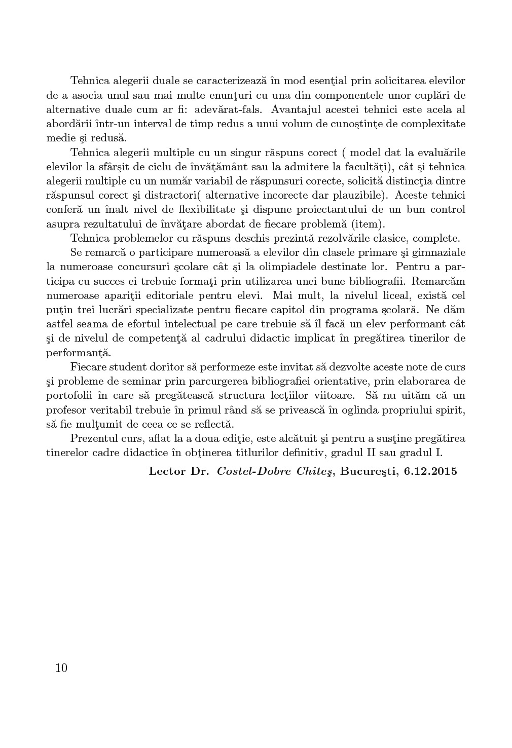 Fiecare student doritor sa performeze este invitat sa dezvolte aceste note de curs si probleme de seminar prin parcurgerea bibliografiei orientative, prin elaborarea de portofolii ın care sa pregateasca structura lectiilor viitoare. Sa nu uitam ca un profesor veritabil trebuie ın primul rand sa se priveasca ın oglinda propriului spirit, sa fie multumit de ceea ce se reflecta.