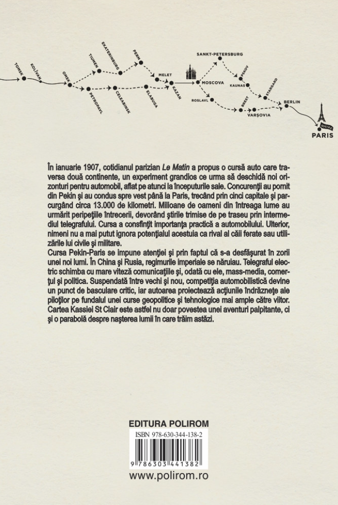 Cursa Pekin-Paris se impune atenţiei şi prin faptul că s-a desfăşurat în zorii unei noi lumi. În China şi Rusia, regimurile imperiale se năruiau. Telegraful electric schimba cu mare viteză comunicaţiile şi, odată cu ele, mass-media, comerţul şi politica. Suspendată între vechi şi nou, competiţia automobilistică devine un punct de basculare critic, iar autoarea proiectează acţiunile îndrăzneţe ale piloţilor pe fundalul unei curse geopolitice şi tehnologice mai ample către viitor. Cartea Kassiei St Clair este astfel nu doar povestea unei aventuri palpitante, ci şi o parabolă despre naşterea lumii în care trăim astăzi.