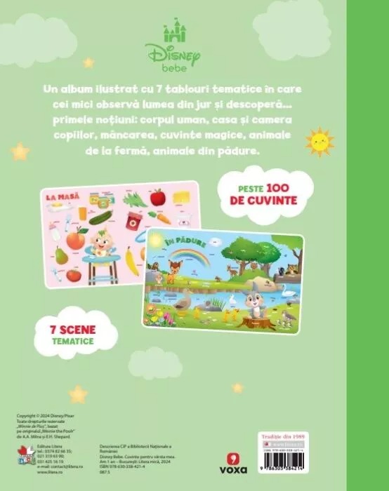 Un album ilustrat cu 7 tablouri tematice în care cei mici observă lumea din jur și descoperă... primele noțiuni: corpul uman, casa și camera copiilor, mâncarea, cuvinte magice, animale de la fermă, animale din pădure.