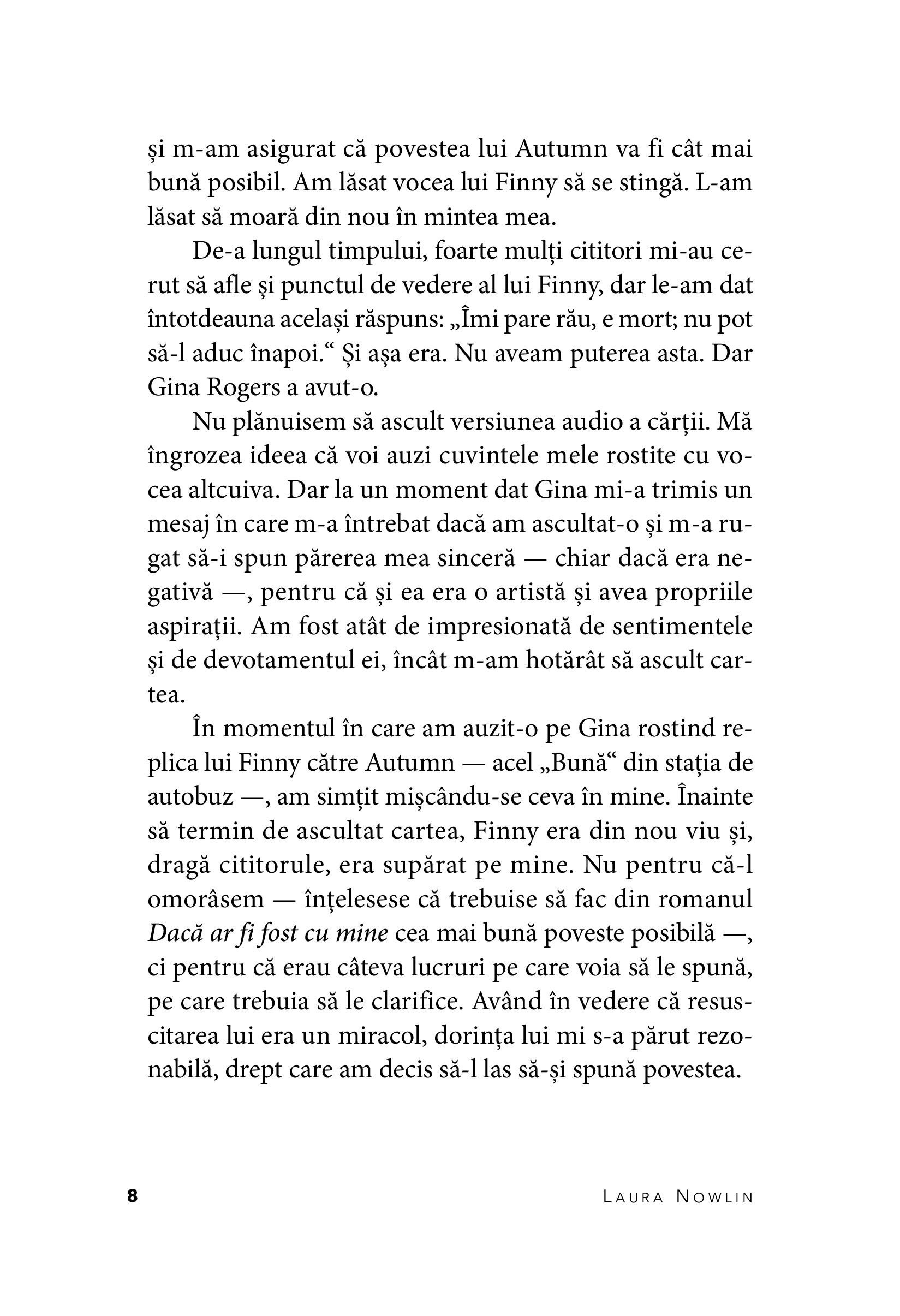 Laura Nowlin a studiat limba și literatura engleză, cu accent pe scriere creativă, la Missouri State University. Nu este doar o scriitoare ambițioasă, ci și o cititoare împătimită. Când nu muncește din greu la propriile romane, Laura lucrează la o bibliotecă publică, ai cărei clienți o inspiră mereu. Locuiește în St. Louis, alături de soțul ei muzician, de câinele lor nevrotic și de o pisică psihotică.