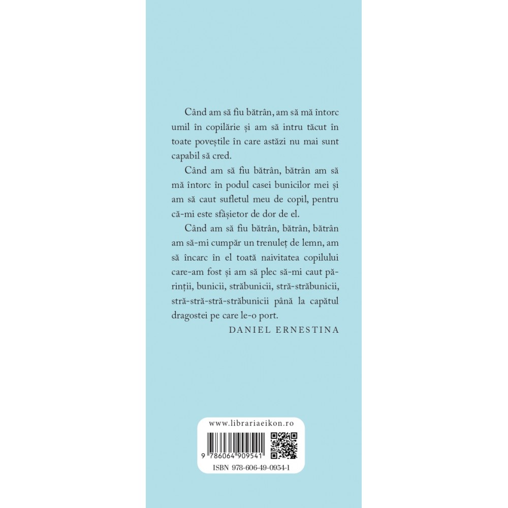 Când am să fiu bătrân, bătrân, bătrân am să-mi cumpăr un trenuleț de lemn, am să încarc în el toată naivitatea copilului care-am fost și am să plec să-mi caut părinții, bunicii, străbunicii, stră-străbunicii, stră-stră-stră-străbunicii, până la capătul dragostei pe care le-o port.”