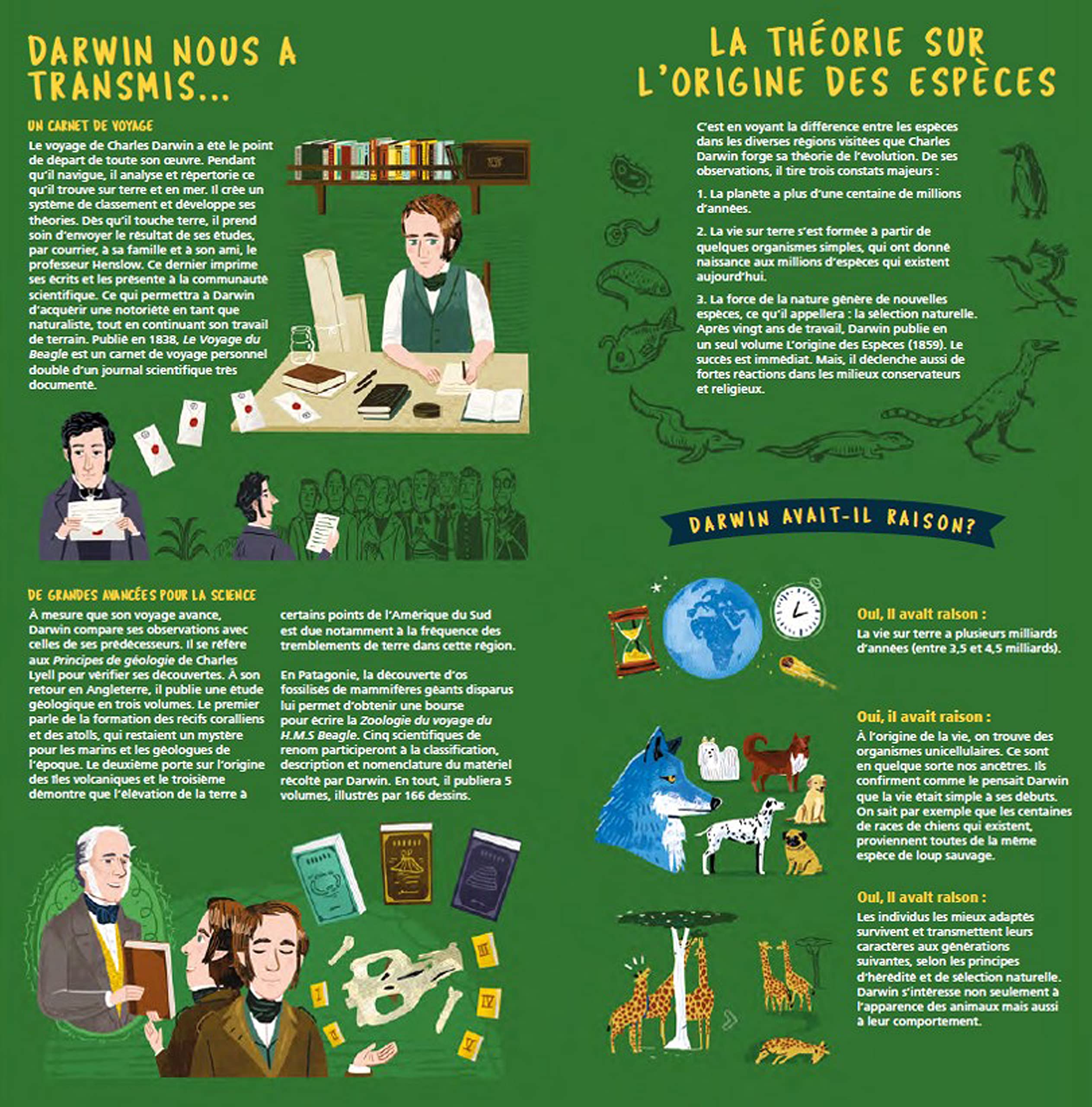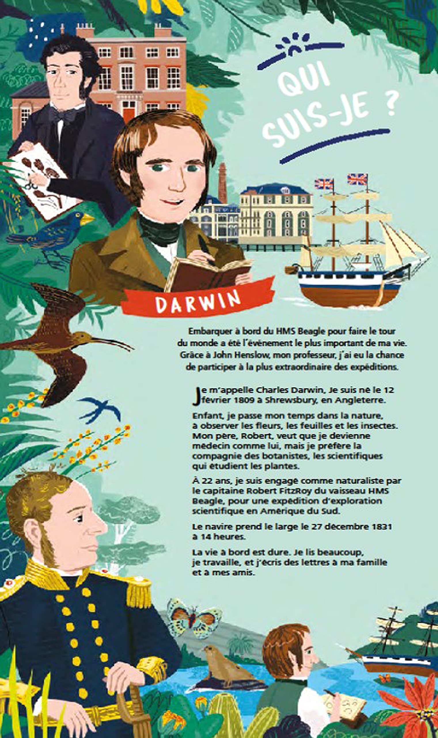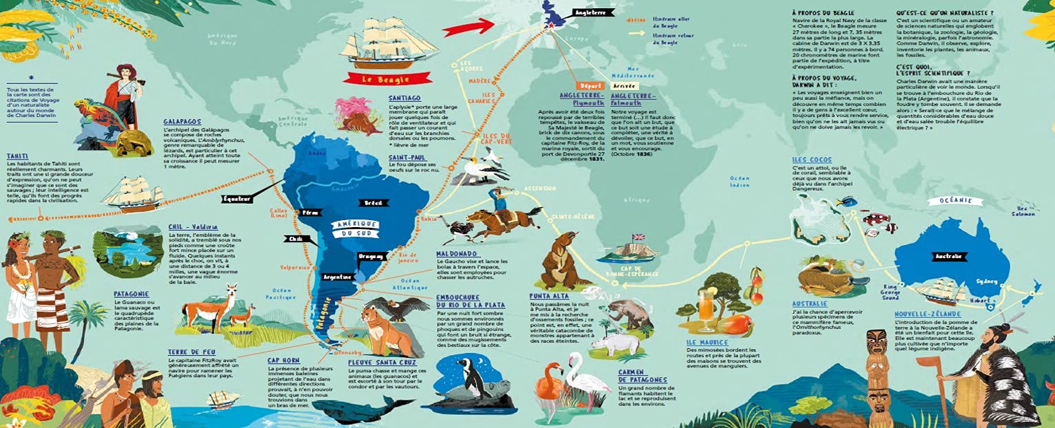 Pars à l'aventure avec DARWIN Quand Charles Darwin embarque à bord du voilier HMS Beagle pour un voyage d'exploration scientifique, il ne sait pas ce qu'il va découvrir, ni quand il reviendra ! Es-tu prêt à vivre ses aventures ? Alors, déplie la carte... Nous sommes au début du XIXe siècle, le monde n'est pas encore complètement connu.