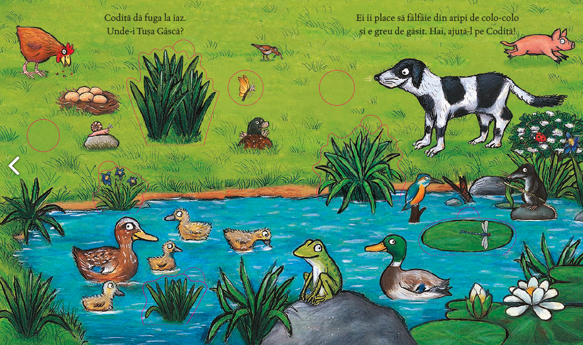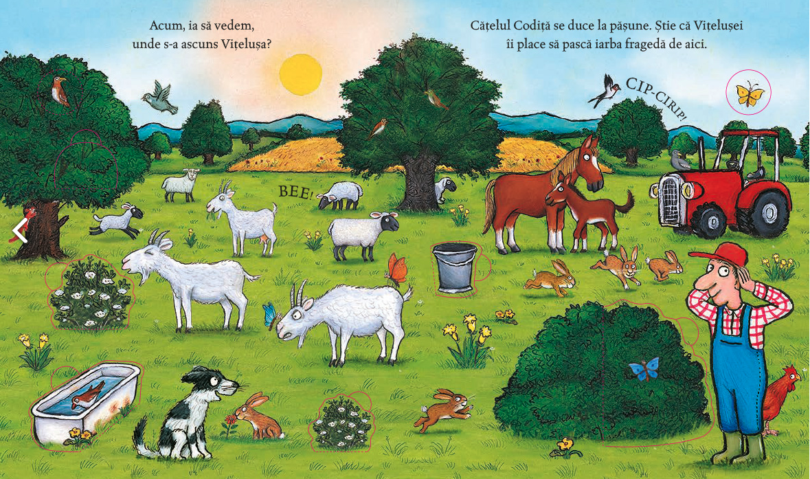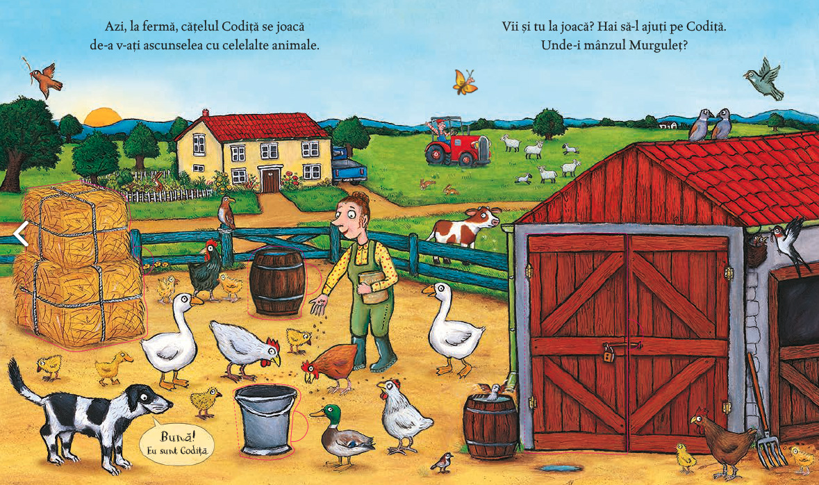 Renumitul ilustrator Axel Scheffler a creat această carte special pentru a dezvolta la copiii mici, care învață cel mai bine prin joacă, atenția, spiritul de observație și abilitățile motorii fine. Cartea este integral cartonată, cu colțuri rotunjite și conține peste 30 de clapete sub care copiii vor fi încântați să descopere animalele din carte împreună cu simpaticul cățel Codiță.