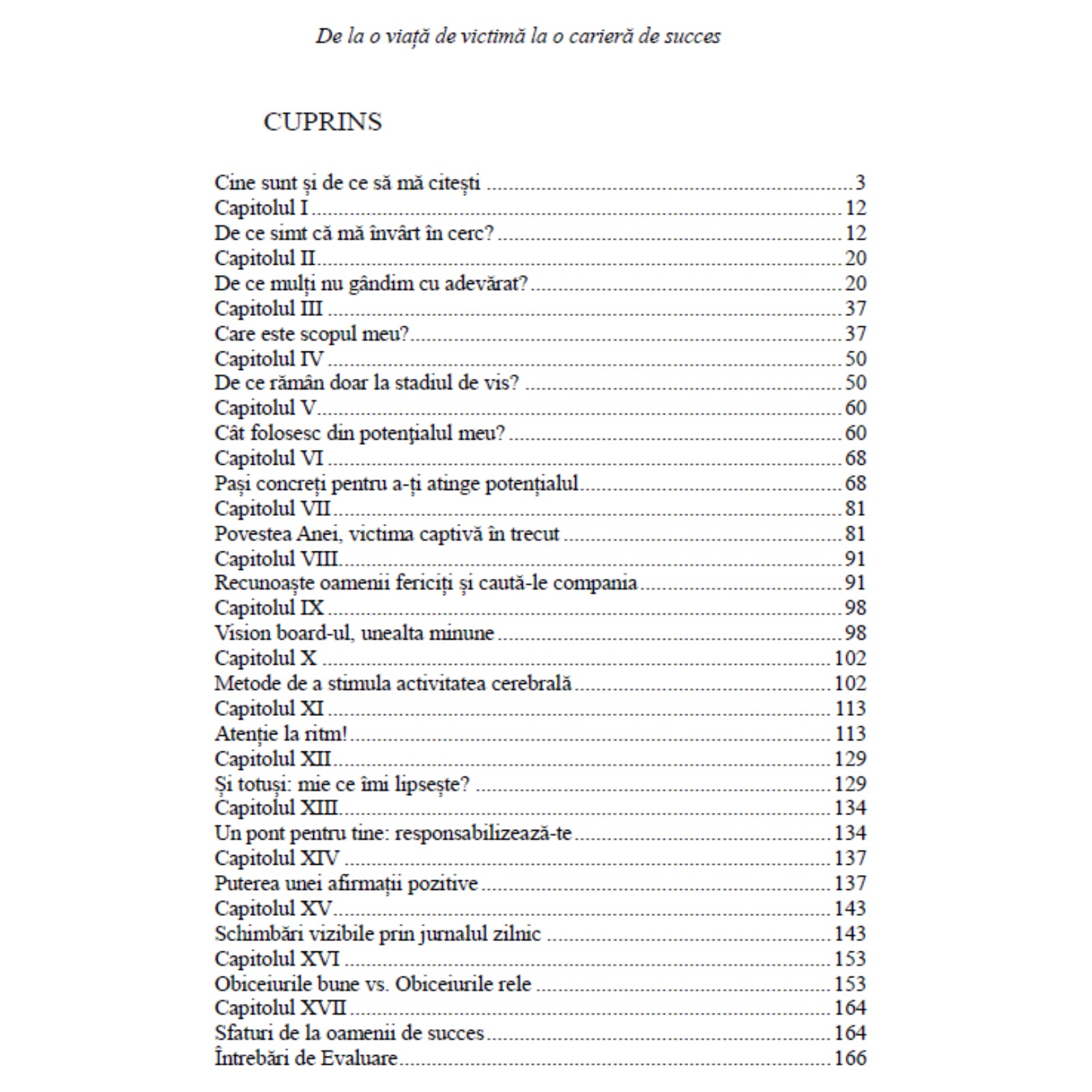 Scrisă într-un limbaj accesibil și motivațional, „De la o viață de victimă la o carieră de succes” te ajută să-ți schimbi mentalitatea, să depășești obstacolele și să îți atingi potențialul maxim.