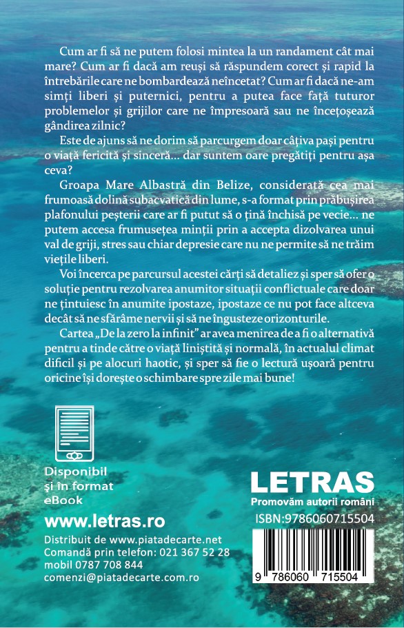 Cartea ,,De la zero la infinit” ar avea menirea de a fi o alternativa pentru a tinde catre o viata linistita si normala, in actualul climat dificil si pe alocuri haotic, si sper sa fie o lectura usoara pentru oricine isi doreste o schimbare spre zile mai bune!