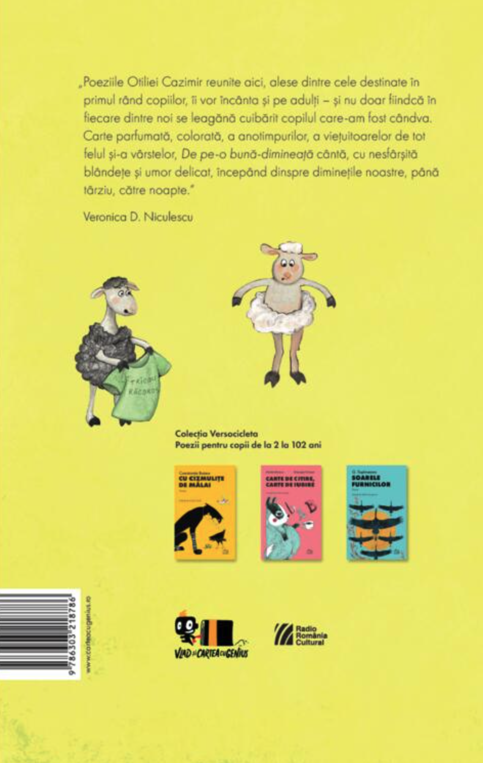 „Poeziile Otiliei Cazimir reunite aici, alese dintre cele destinate în primul rând copiilor, îi vor încânta și pe adulți – și nu doar fiindcă în fiecare dintre noi se leagănă cuibărit copilul care-am fost cândva. Carte parfumată, colorată, a anotimpurilor, a viețuitoarelor de tot felul și-a vârstelor, De pe-o bună-dimineață cântă, cu nesfârșită blândețe și umor delicat, începând dinspre diminețile noastre, până târziu, către noapte.” -- Veronica D. Niculescu