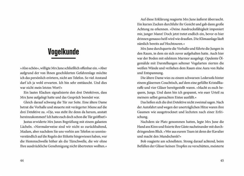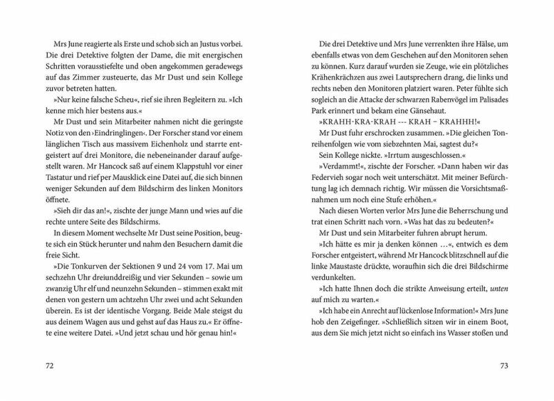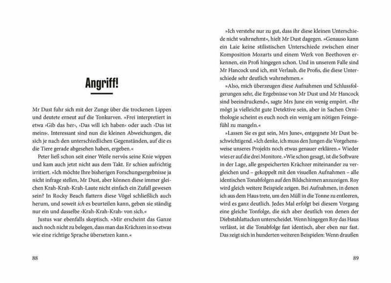 Die Krähen sind los! Als Peter Shaw durch den Palisades Park joggt, wird er Zeuge eines unheimlichen Vorfalls: Er hört lautes Gekrächze und Hilfeschreie. Ein Mann wird von einem Schwarm Krähen attackiert! Nur schwer lassen sich die Vögel vertreiben. Warum haben sie das getan? Ein unheimliches Ereignis, das an Alfred Hitchcocks berühmten Film "Die Vögel" erinnert. In ihrem neuen Fall treffen Justus, Jonas, Peter Shaw und Bob Andrews auf ungewöhnliche Gegner. Haben Krähen eine eigene Sprache, um sich gegen Menschen zu verbünden? Auf die Leserinnen und Leser wartet ein spannendes Abenteuer!