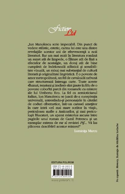 Alexandru Robe are 38 de ani, casa, masina si o iubita pentru care e invidiat. Ziua preda la Literele bucurestene, iar noaptea studiaza mecanica dezastrelor aviatice si sparge computerele vecinilor. O viata perfecta, care se spulbera in clipa cind observa ca, de ani buni, cineva ii umbla prin amintiri, cu scopul de a le vinde pe piata neagra. Ajutat de prieteni (matematicianul Mihnea, graficianul Cezar, avocatul Lupu si, mai ales, experta in arta Maria) si de o scrisoare gasita in dosarul bunicului Vitalian, Robe incepe sa-i caute pe cei care i-au trucat biografia. Detectivistica il va purta prin „epoca Ceausescu” si anul 1918, spre culisele lui Dej si afacerile tranzitiei, in paginile revistei Pif si ale literaturii interbelice, pe strazile Parisului si in cafenelele vieneze. Dar Robe e la rindul lui urmarit de citeva organizatii misterioase (globalmind, Anticarii, Uniunea) si de cel mai mare scriitor roman in viata. Cine este acesta, de ce trebuie rapit si, mai ales, cum va scapa dom’ profesor de traficantii memoriei? Raspunsurile, intr-un roman palpitant despre lumea din jurul nostru.