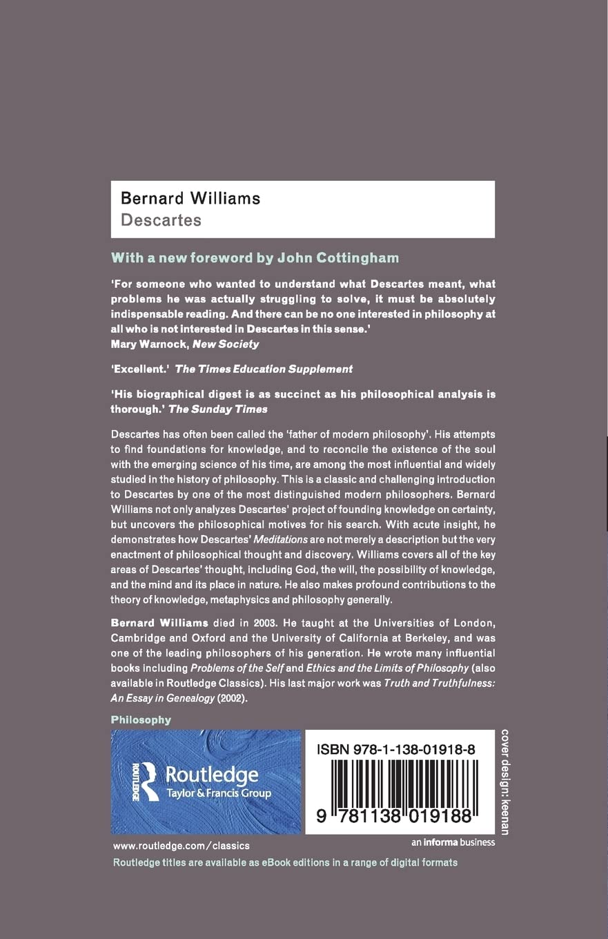 Descartes has often been called the 'father of modern philosophy'. His attempts to find foundations for knowledge, and to reconcile the existence of the soul with the emerging science of his time, are among the most influential and widely studied in the history of philosophy. This is a classic and challenging introduction to Descartes by one of the most distinguished modern philosophers. Bernard Williams not only analyzes Descartes' project of founding knowledge on certainty, but uncovers the philosophical motives for his search. With acute insight, he demonstrates how Descartes' Meditations are not merely a description but the very enactment of philosophical thought and discovery. Williams covers all of the key areas of Descartes' thought, including God, the will, the possibility of knowledge, and the mind and its place in nature. He also makes profound contributions to the theory of knowledge, metaphysics and philosophy generally.