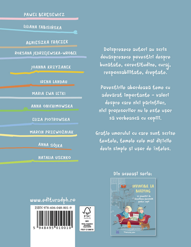 Cartea este o colecție de 12 povestiri de dezvoltare personală pentru copii, scrisă de 12 autori. Fiecare poveste abordează valori precum prietenia, corectitudinea, respectul, bunătatea, curajul și autodisciplina. Povestirile sunt scrise într-un stil accesibil și plin de umor, potrivite pentru a-i ajuta pe copii să se identifice cu personajele și să înțeleagă mai ușor importanța valorilor umane în viața de zi cu zi.